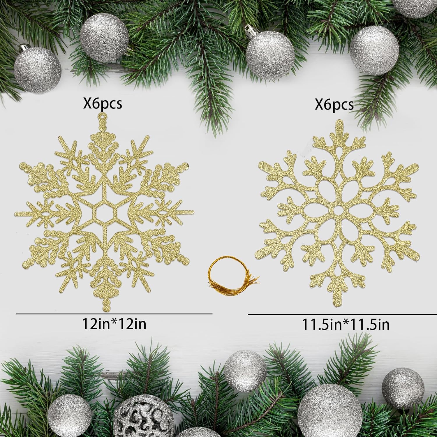 - What's in the box: You will receive 12pcs big gold snowflakes, approximately 12 inches in height, featuring two different designs. Additionally, each Each glitter gold snowflakes decoration comes with a hanging string for easy display. These large size snowflakes ornaments are perfect for both indoor and outdoor winter Christmas decorations, adding a unique festive atmosphere to your holiday celebrations