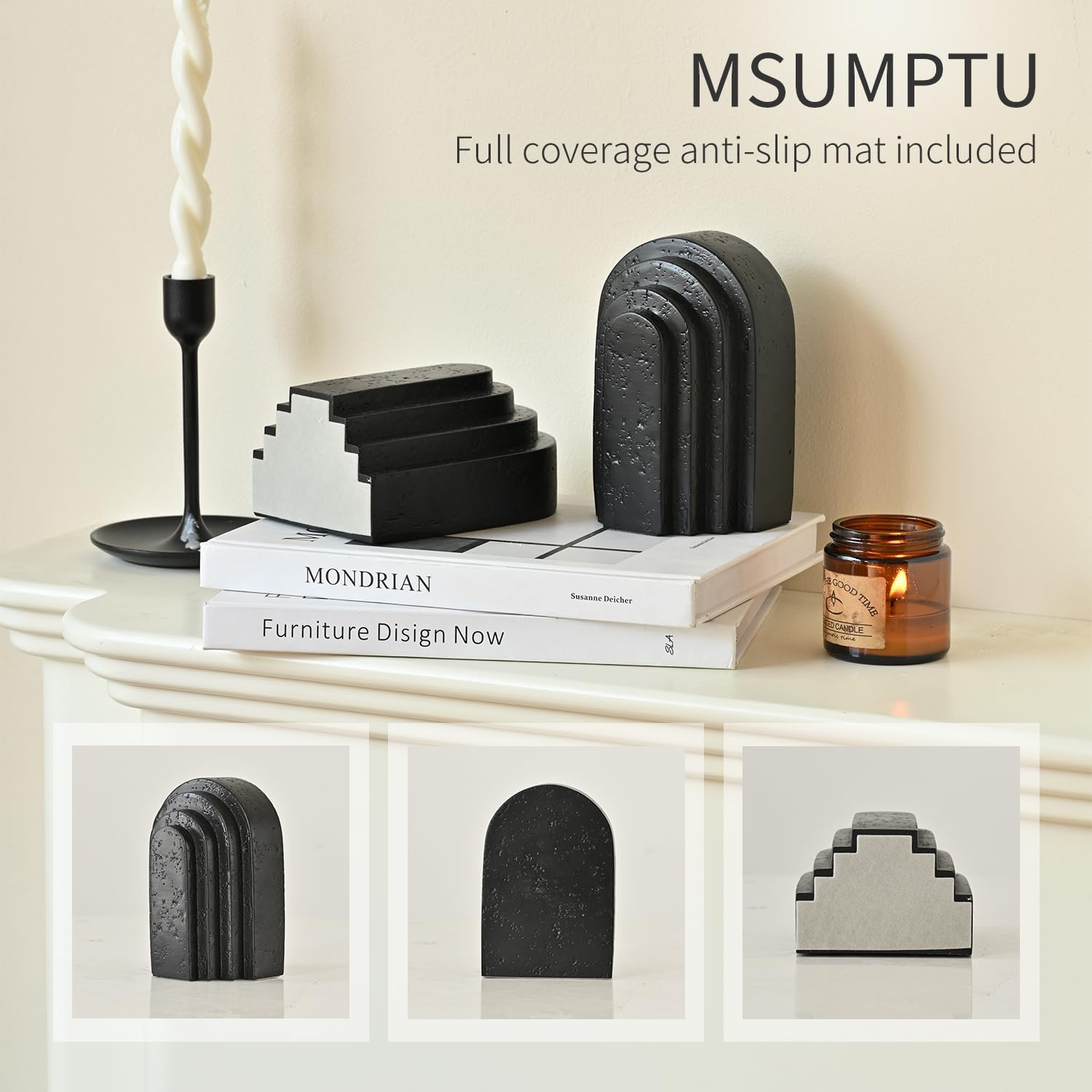 Decorative Bookends for Shelves, Set of 2 Book Ends for Heavy Books, Layered Arch Design Black Bookend