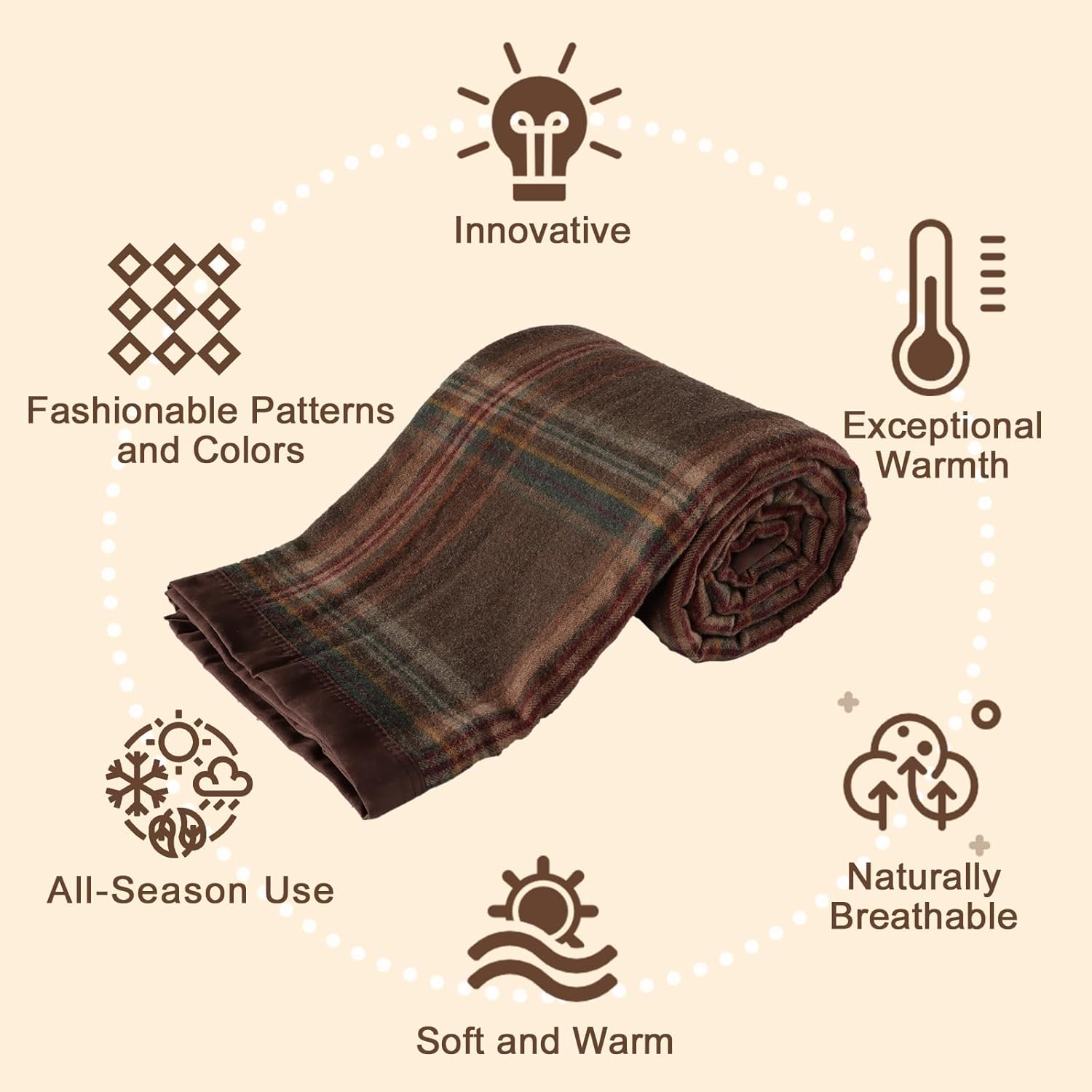 YOUR MOON 100% Pure Merino Wool Twin Size, Australian Organic Natural Wool Blanket, Hypoallergenic Wool Blanket for Bed, Medium Weight(Plaid Brown, 66 * 90)