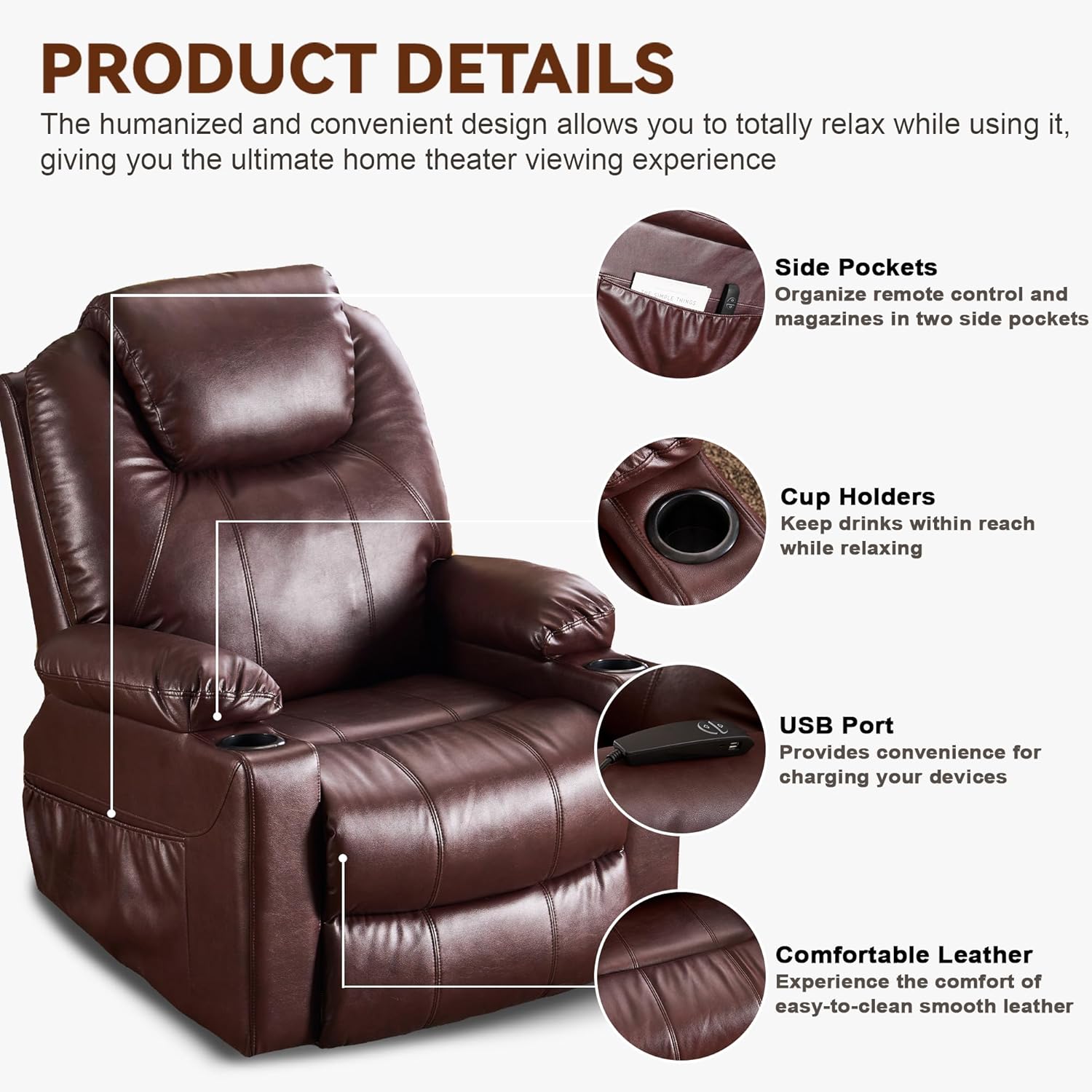 - User-Friendly Design: The modern recliner chair is equipped with two cup holders, side pockets, USB and type C charging ports (ONLY for low-power devices) to keep essentials within reach, providing you with enjoyable home theater seating and reading experience, ideal for living room, reading room, bedroom and so on