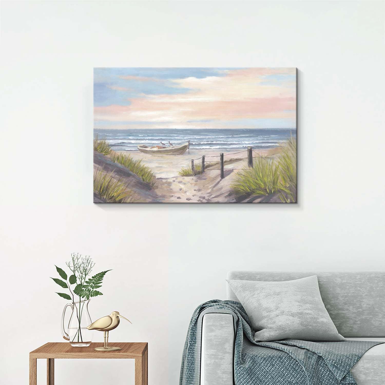 - Premium Beach House Artwork Crafted with gallery-wrapped canvas and a solid wood frame, this ocean wall art withstands daily wear. The textured brushstrokes mimic real seascape paintings, making it ideal for coastal home decor.