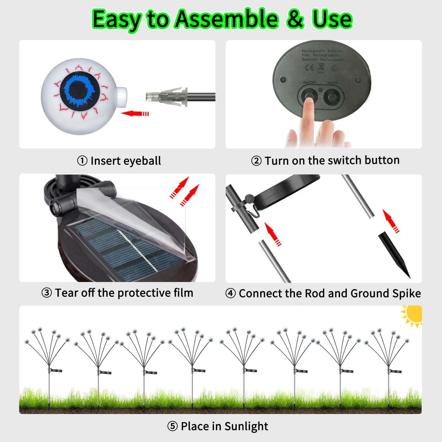 - Easy to Assemble οΌ Widely Used: The outdoor solar lights just need insert the eyeball, then connect the rod and ground spike. They can be used in garden, yard , courtyard, path, lawn, terrace, and other places, it's the perfect choice for outdoor halloween decorations.