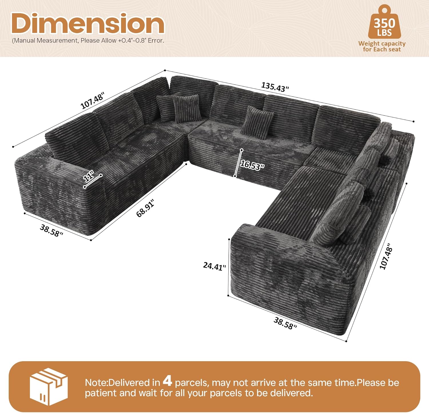 Cloud Sectional Couches for Living Room,U Shaped Modular Sofas No Assembly,135x107 Inches Plush Corduroy Oversized Floor Couch Set with Deep Seat Chaise,Grey