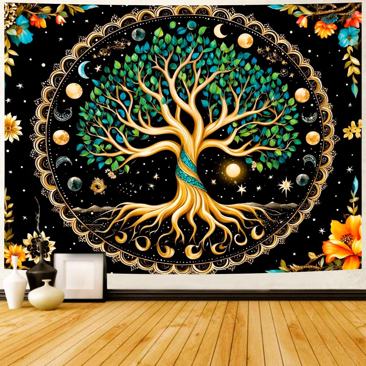 Delur Tree of Life Tapestry Moon Phase Nature Flower Plant Tapestry Wall Hanging Boho Mandala Spiritual Sun Aesthetic Psychedelic Headboard for Bedroom Living Room Home Decor (51.2" x 59.1")