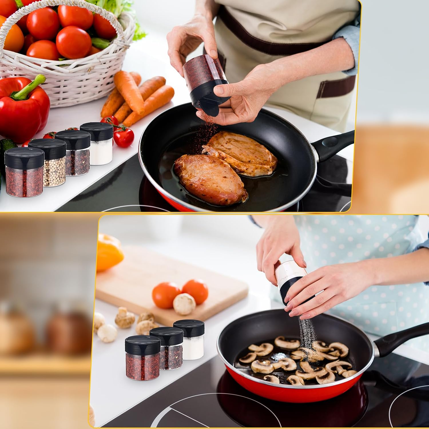 - Easy to Use: these spice shaker containers are two-sided flip tops for shaking or pouring spices, and you can choose the appropriate part of the lid according to your needs. There is a removable inner seal under the lid of the jar to prevent them from coming into contact with the air and keep the food fresh and delicious