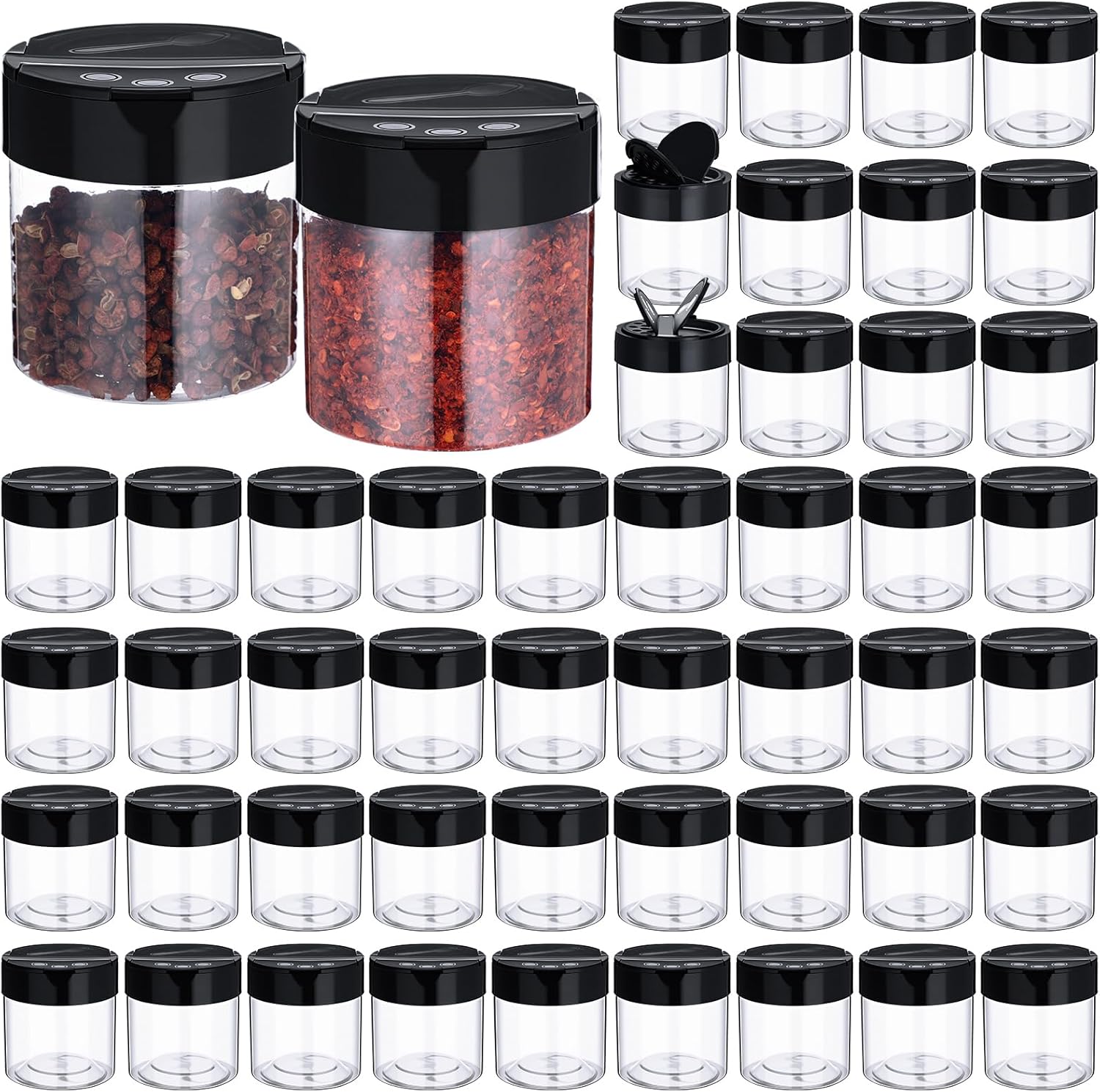 - Multi-Purpose: these plastic spice jars with shaker lids are perfect for storing dried spices, salt, peppers, seasonings, herb blends, powder, glitter, bath salts, crafts, etc.widely applied in kitchens, canteens, hotels, restaurants, cake shops and other places