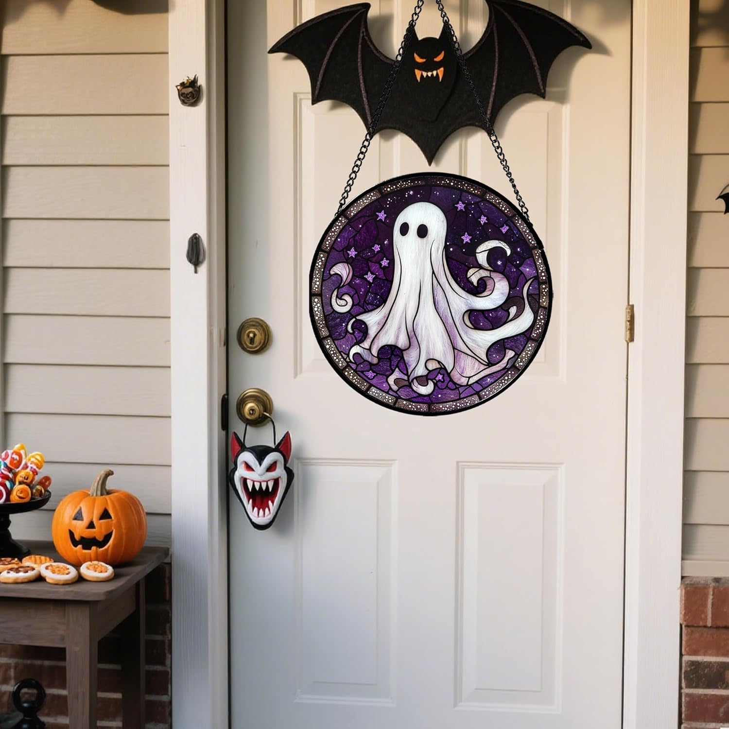 Stained Glass Window Hanging - Halloween Decorations White Ghost Purple Stars Suncatcher for Doors Garden Spooky Funny Sun Catchers Gothic Decor Horror Gifts for Women Men Friend 7.8 in
