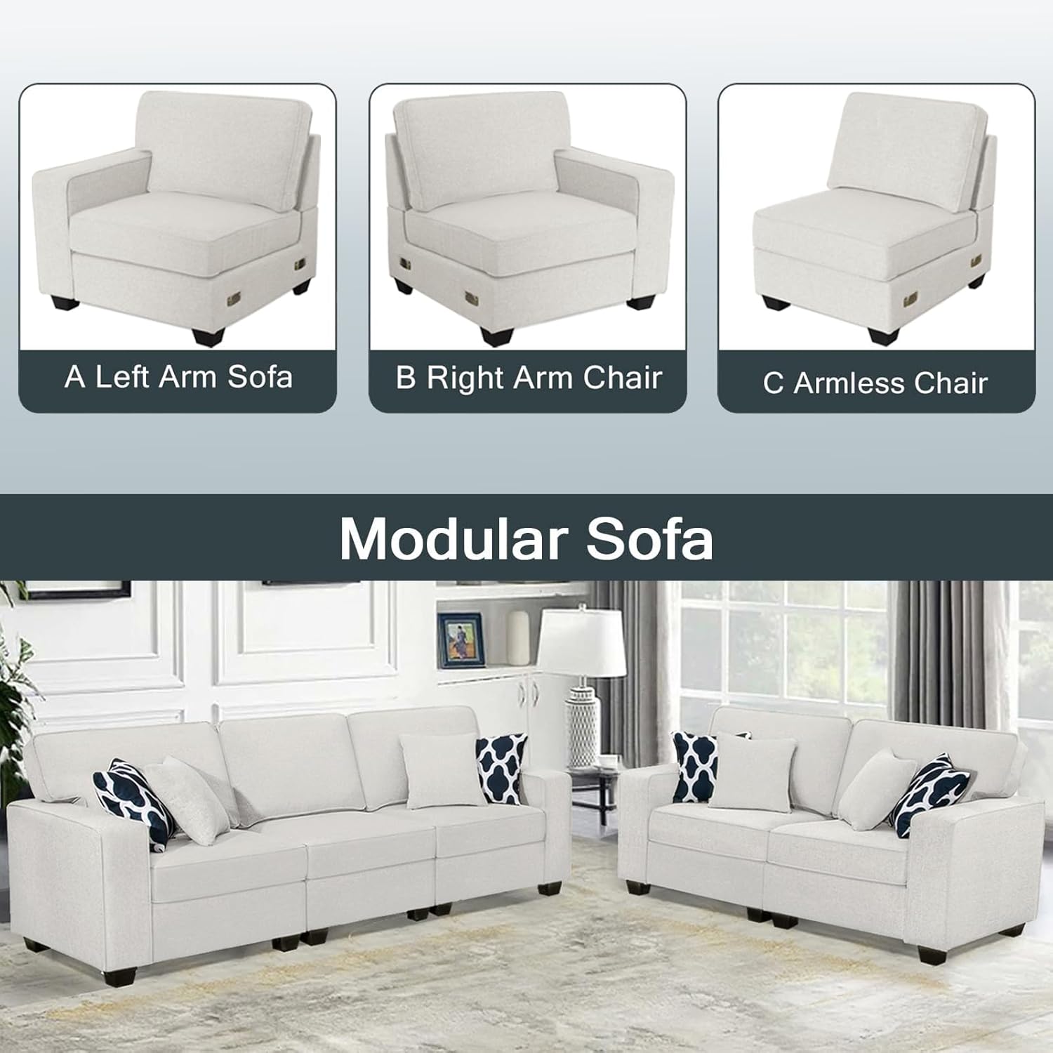 - ăHigh Quality FabricăThe modular sectional sofa is made of soft and comfortable polyester fabric, which highlights the exquisite texture of the sectional sofa and gives you a comfortable touch experience. The fabric of the sectional couch is not easy to wrinkle and durable, extending the use of the sectional couches. The beautifully modernized look of the modular couch is designed to fit perfectly into a variety of spaces such as the living room.