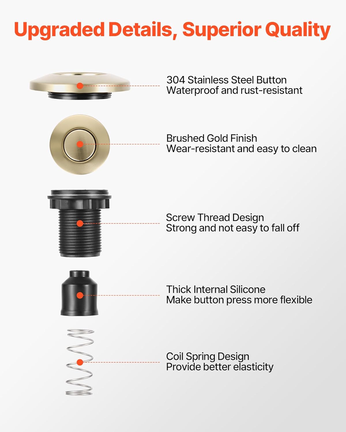 - Durable & Safe: The cover of the garbage disposal air switch button is made of waterproof stainless steel with a brushed gold finish, resistant to rust and wear. It’s responsive to press - gently press to turn on the garbage disposal, and press again to turn it off