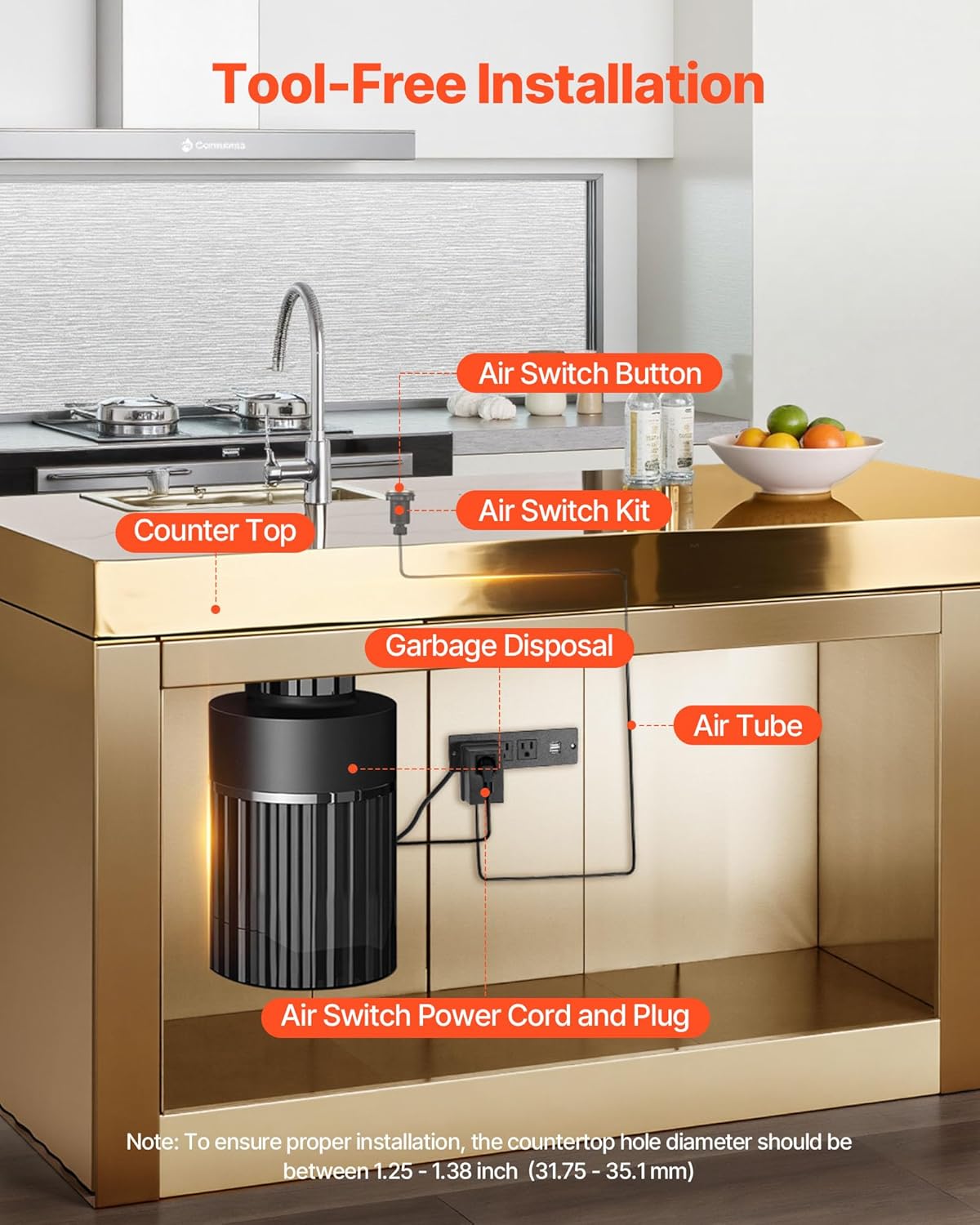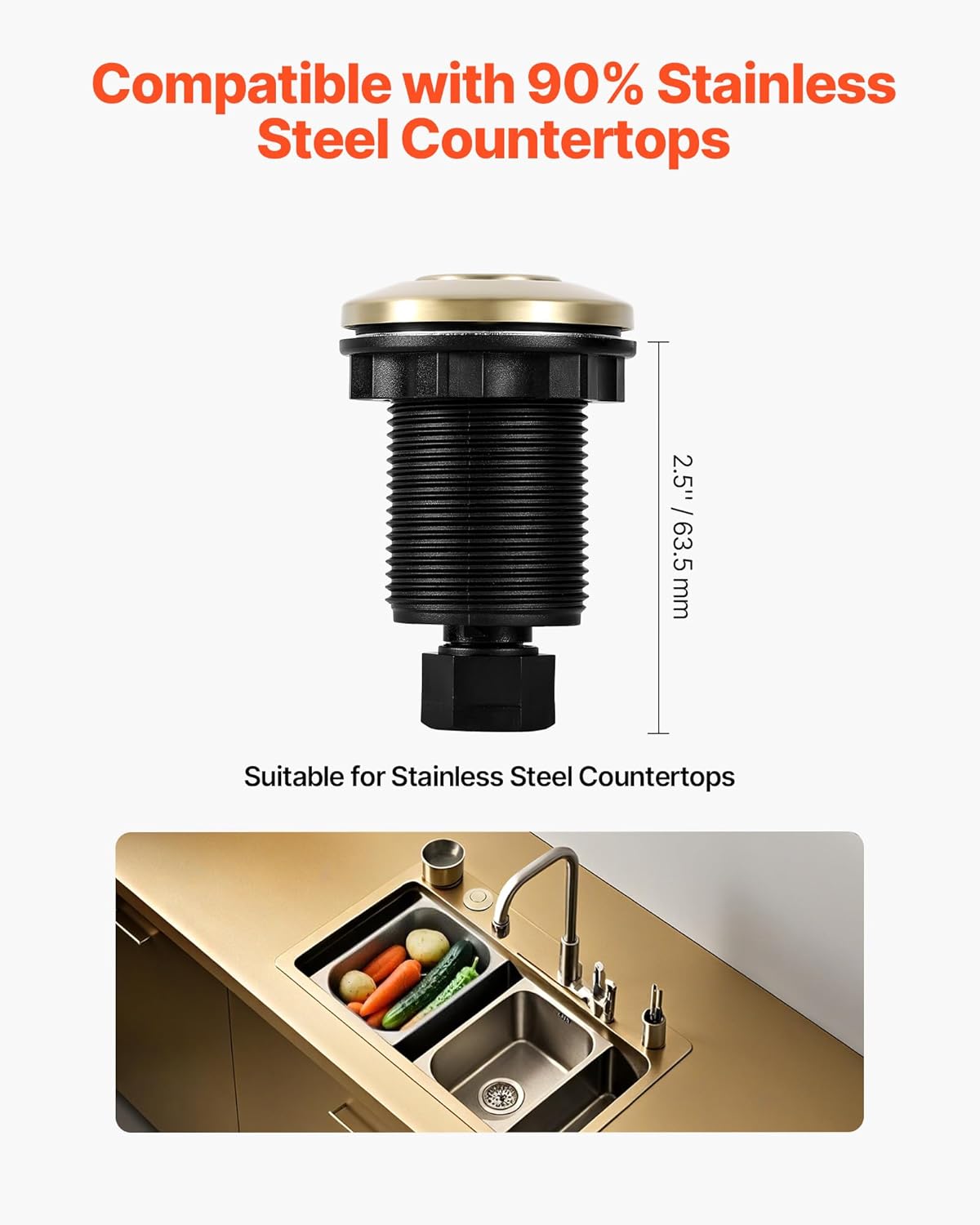 - Wide Compatibility: This VEVOR garbage disposal air switch kit fits standard sink hole diameters of 1.25–1.38 inch / 31.75–35.1 mm. The air switch button is 2.5 inch / 63.5 mm long, suitable for stainless steel sink countertops and compatible with most garbage disposal brands (≤2HP)
