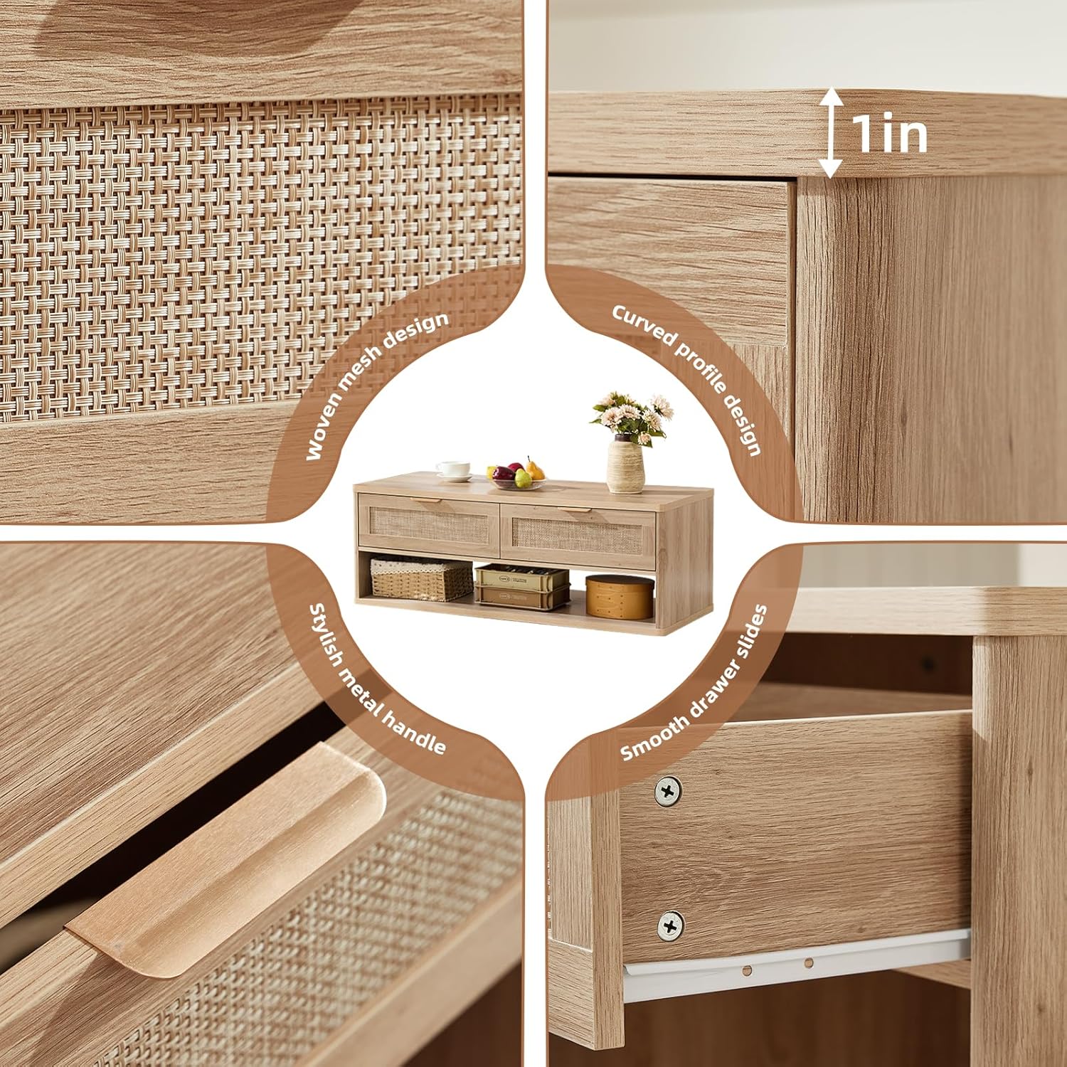 LEYAOYAO 48" Farmhouse Boho Rattan Coffee Table with 2 Woven Drawers,Rectangular Coffee Tables with Hidden Storage Compartment,Curved Profile Design,Wooden Center Table for Living Room,Natual Wood