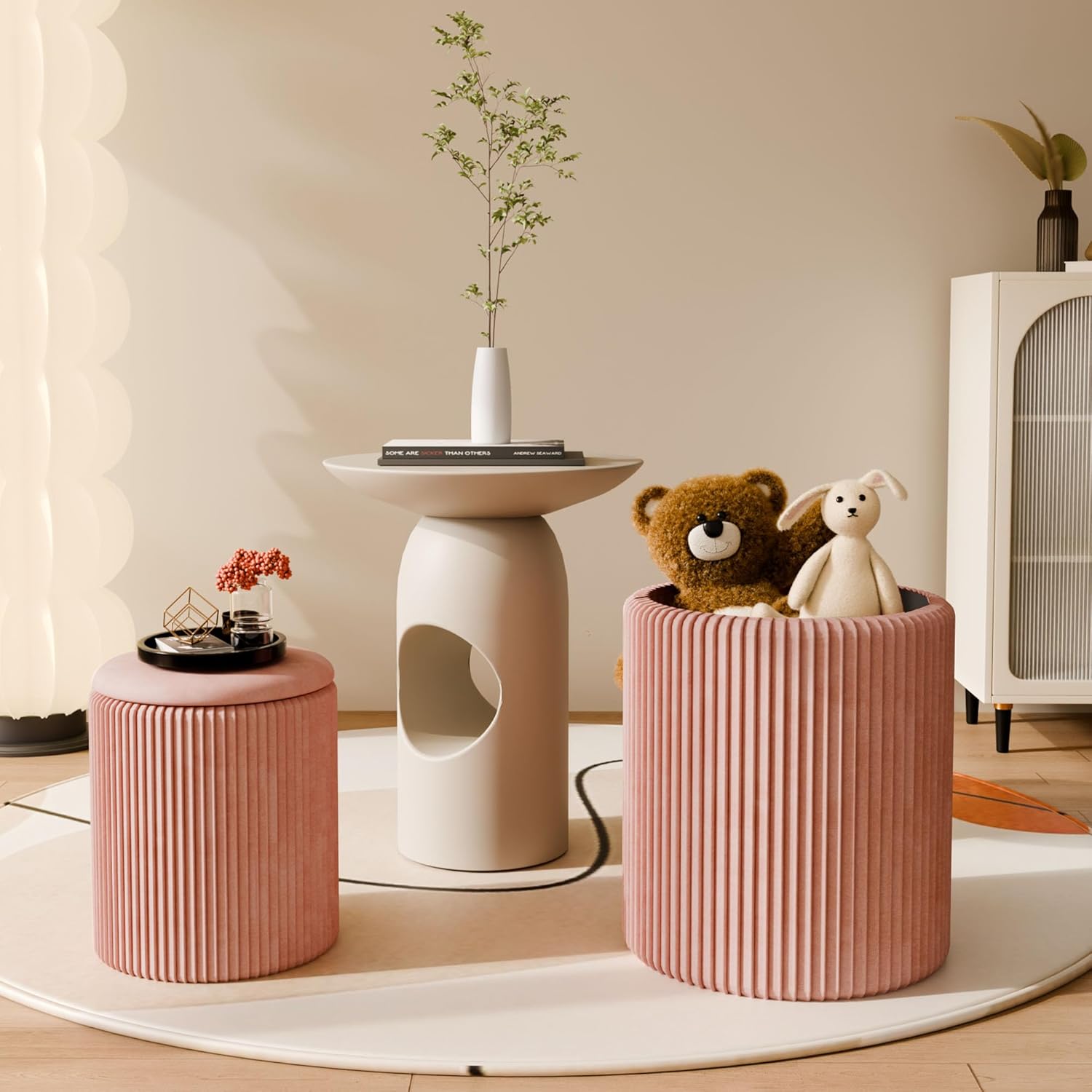 Ottoman with Storage Set of 2, Velvet Storage Ottoman, Upholstered Sponge Vanity Stool Support 300lbs, Multifunctional Coffee Table Foot Rest Ottomans for Living Room Bedroom, Pink