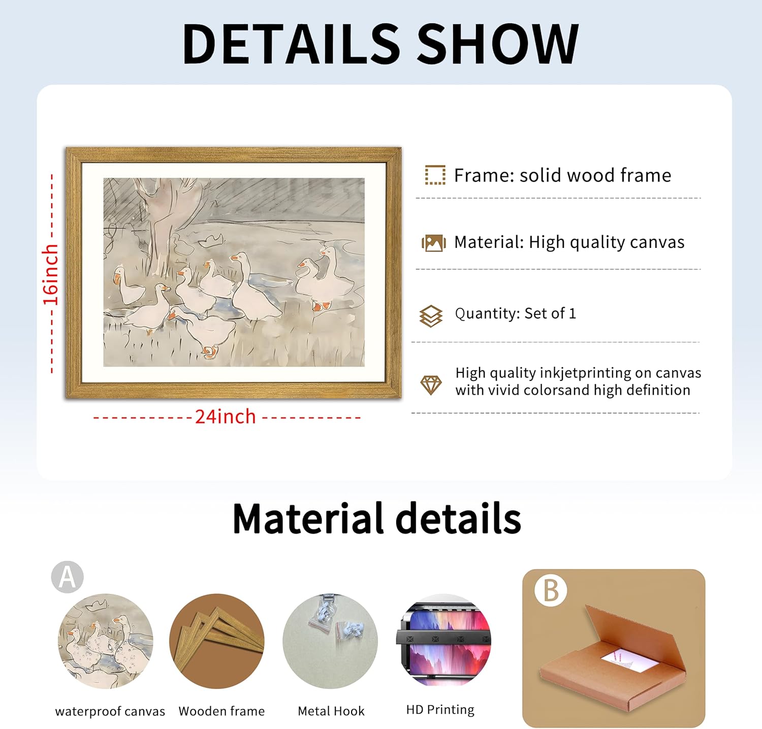 Vintage Framed Goose Wall Art Watercolor Print, Rustic Farm Duck Decor Canvas Painting, Minimalist Pastoral Poster Picture, Country Cottage Wall Decor for Living Room Kitchen Bathroom Bedroom 16x24 in