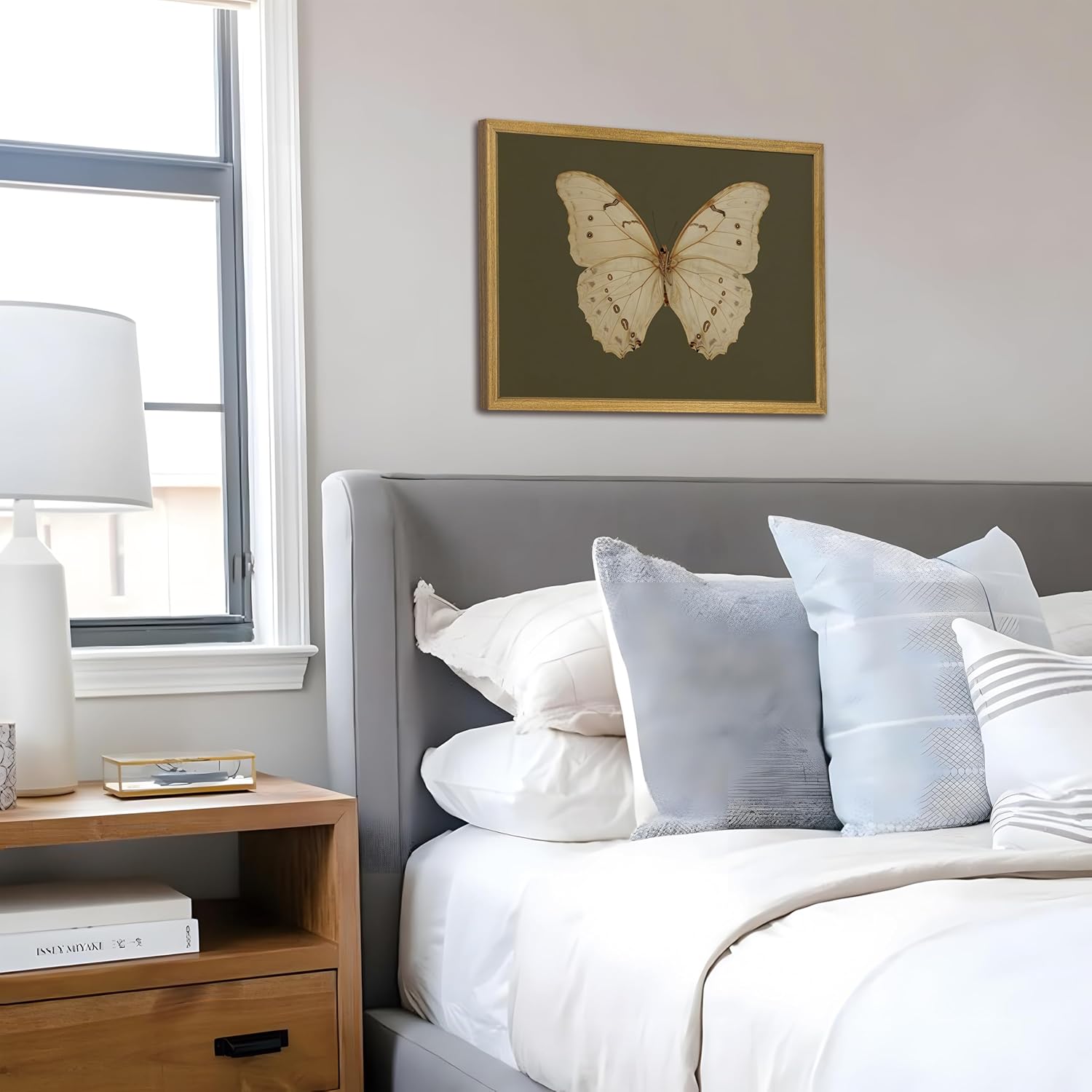 Wood Framed White Butterfly Wall Art, Vintage Butterfly Oil Paintings, Dark Moody Insect Canvas Prints, Boho Sage Green Wall Decor, for Bedroom Kitchen Bathroom Cottagecore Room Decor - 12x16 Inch