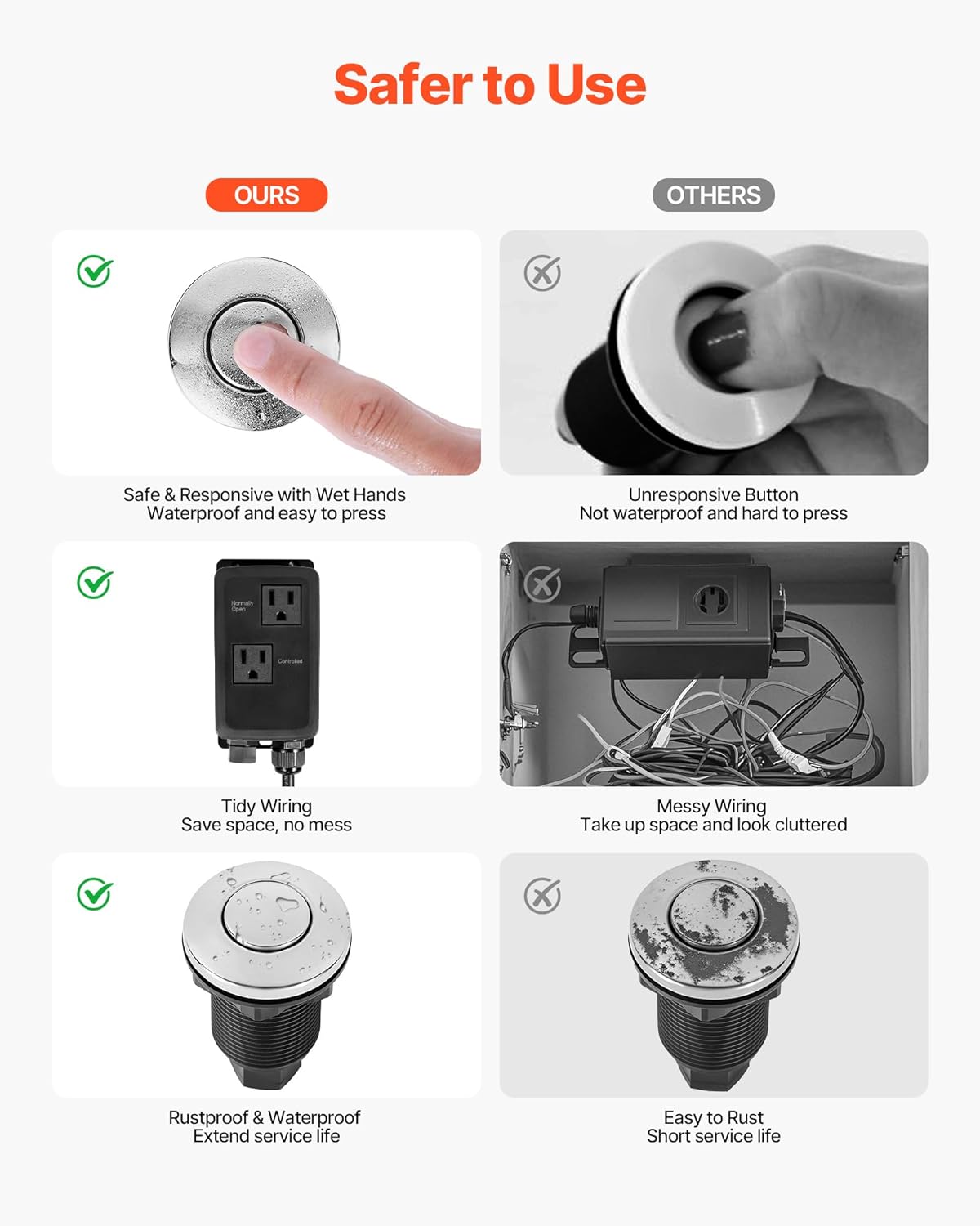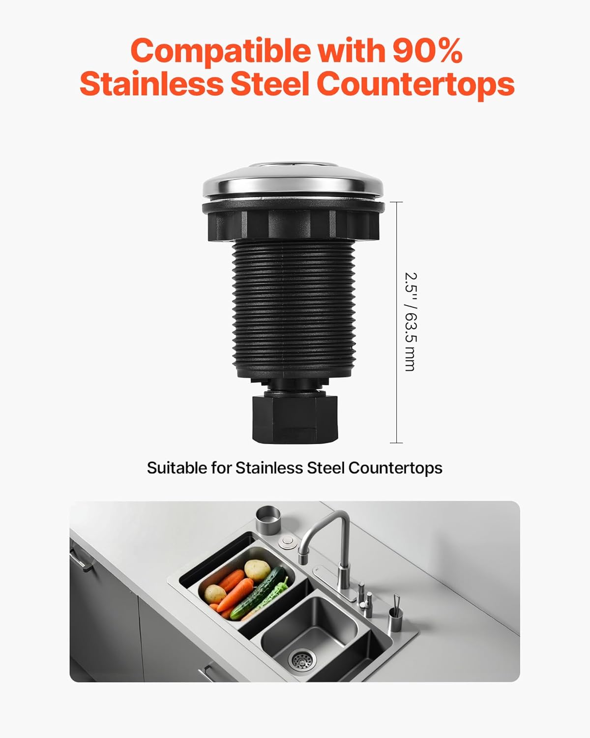 - Wide Compatibility: This VEVOR garbage disposal air switch kit fits standard sink hole diameters of 1.25–1.38 inch / 31.75–35.1 mm. The air switch button is 2.5 inch / 63.5 mm long, suitable for stainless steel sink countertops and compatible with most garbage disposal brands (≤2HP)