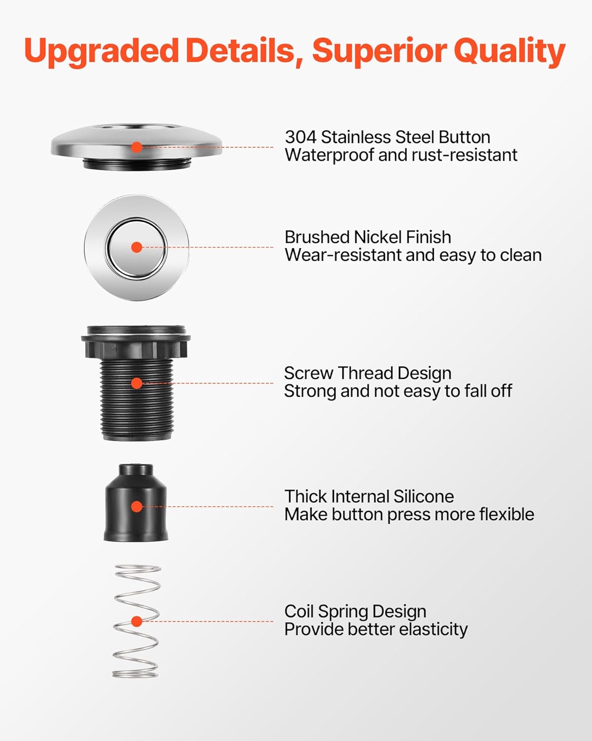 - Durable & Safe: The cover of the garbage disposal air switch button is made of waterproof stainless steel with a brushed nickel finish, resistant to rust and wear. It's responsive to press - gently press to turn on the garbage disposal, and press again to turn it off