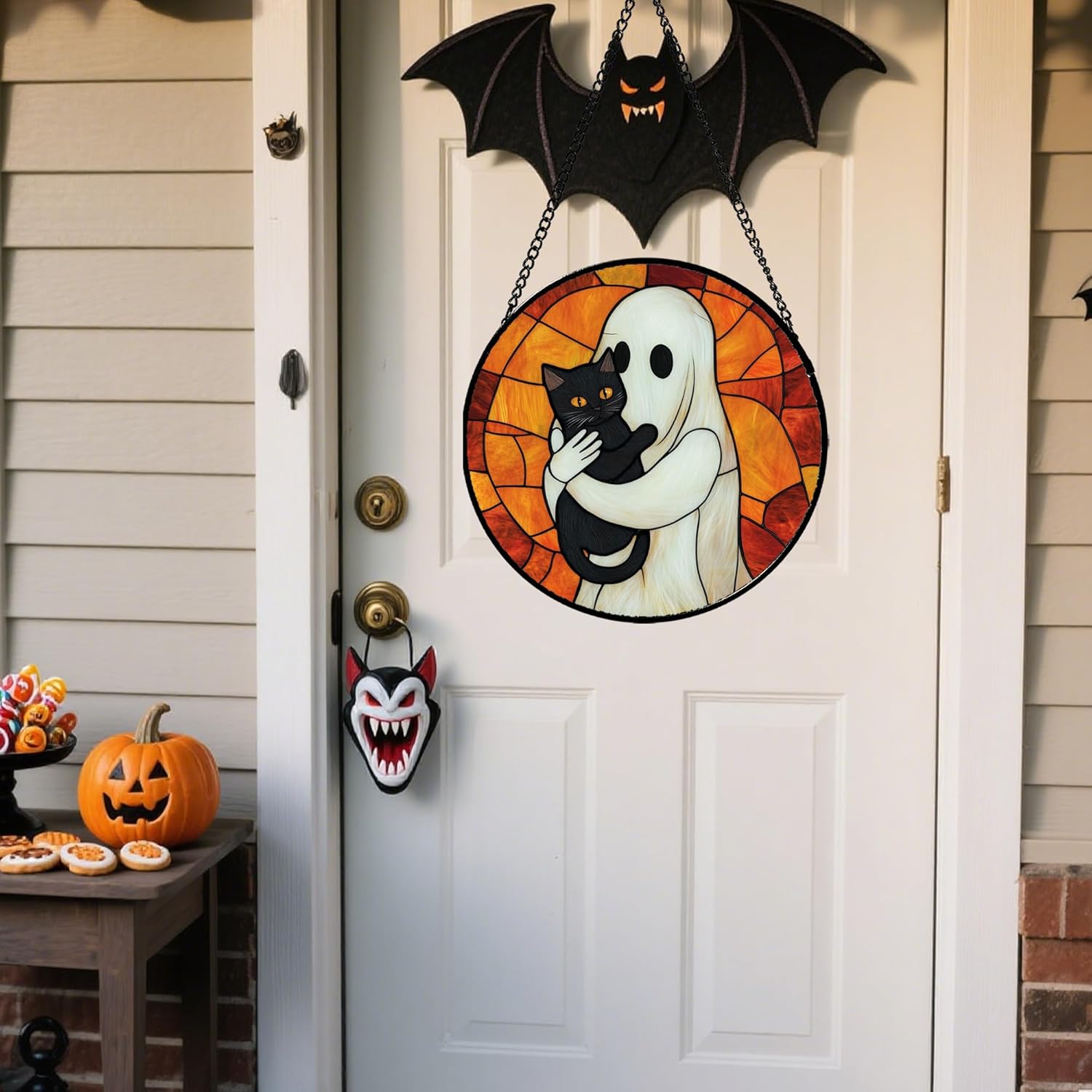 Stained Glass Window Hanging - Halloween Decorations White Ghost Black Cat Suncatcher for Doors Garden Spooky Funny Orange Sun Catchers Gothic Decor Horror Gifts for Women Men Friend 7.8 in