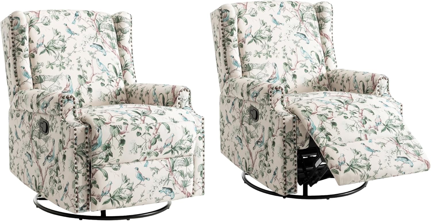 UIXE Swivel Rocker Manual Recliner Chairs Set of 2, Wingback Swivel Glider Fabric Nursery Reclining Sofa Chair, High Back Upholstered Arm Chair for Living Room Bedroom - Bird Pattern
