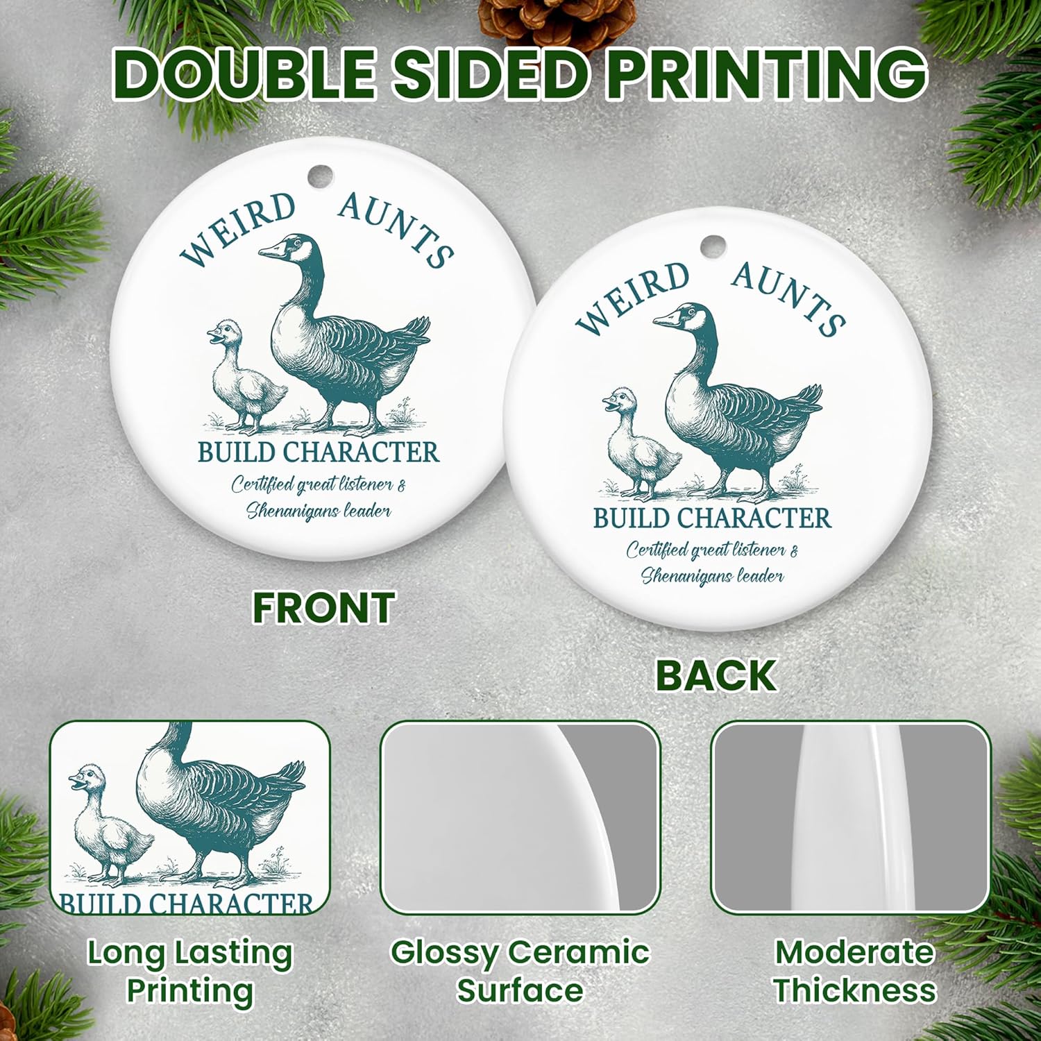 - HIGH QUALITY CERAMIC DESIGN β Made of premium ceramic with a glossy finish, these animal Christmas ornaments are durable and scratch-resistant. A lasting keepsake as aunt gifts from niece, it reflects family humor and love. These Christmas gifts for women double as stylish auntie gifts for joyful, laughter-filled Christmas tree decor.