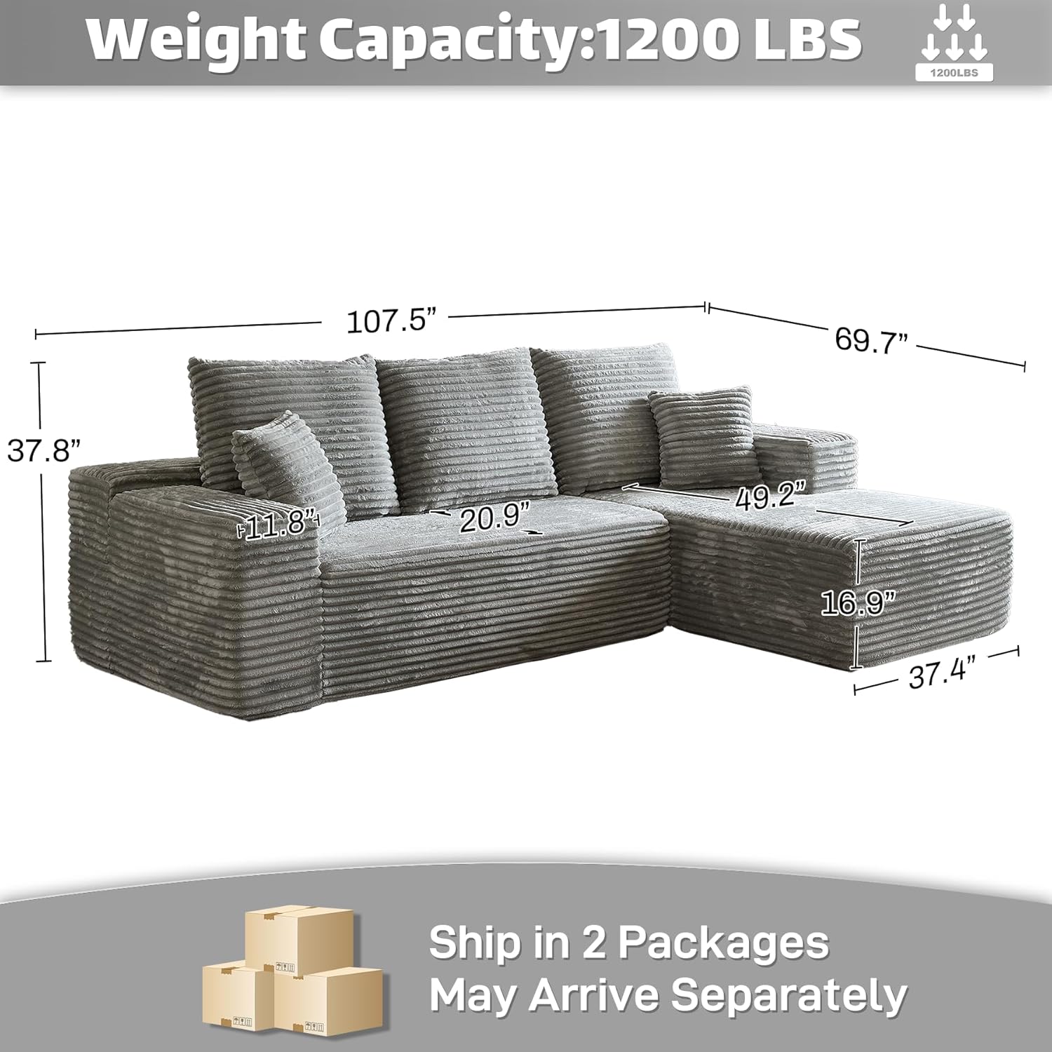 HYJT-H&K Modular Sectional Sofa Cloud Secttional Couch, 107" Comfy L Shaped Couches for Living Room, Deep Seat Memory Foam Fluffy Plush Corduroy Boneless Couch Sectionals Right Facing Sofa Chaise Grey