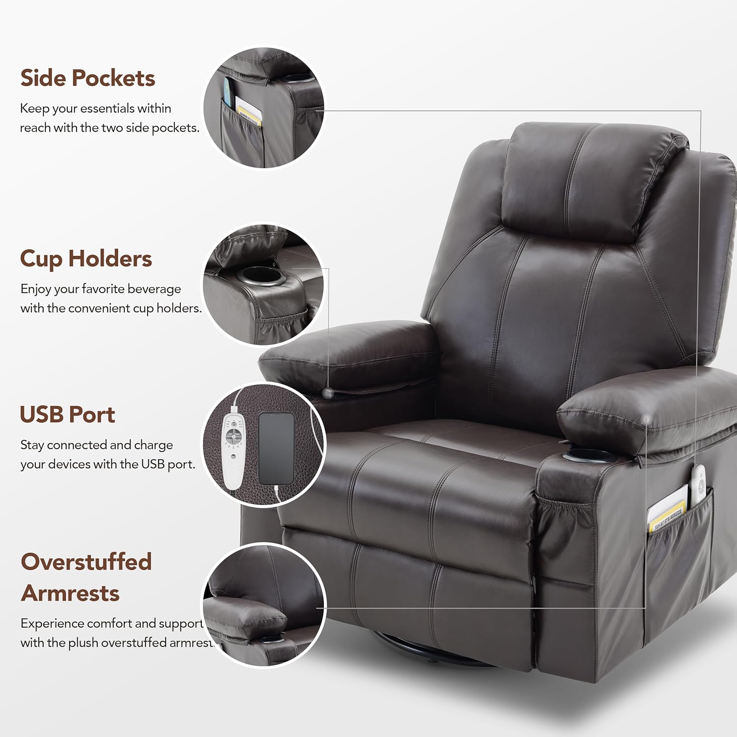 Oversized Swivel Rocker Recliner Chair with Heat and Massage, 360 Degree Swivel Rocking Single Sofa with Cup Holders and USB Port, Large Big Recliner Chair for Living Room (Leather, Brown)