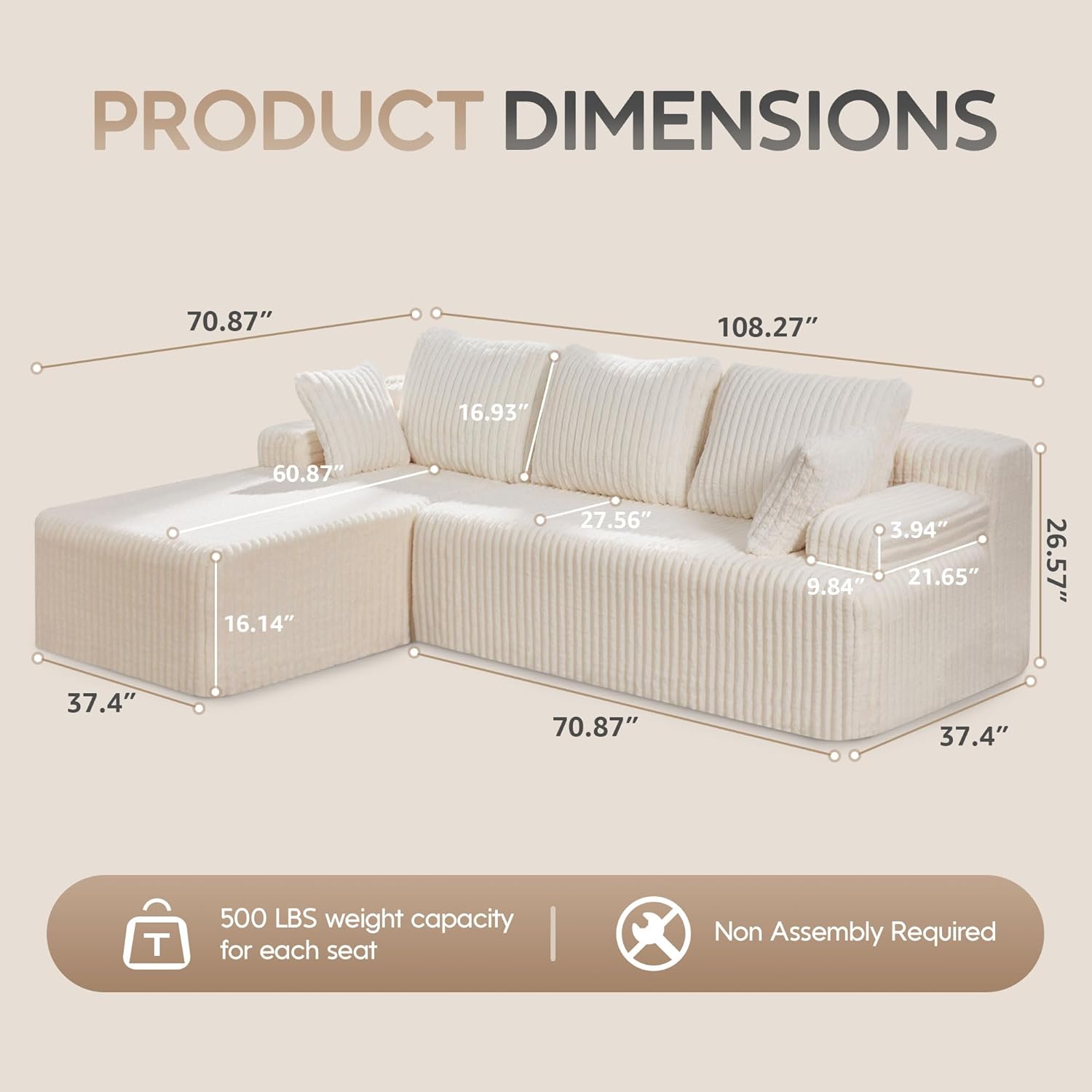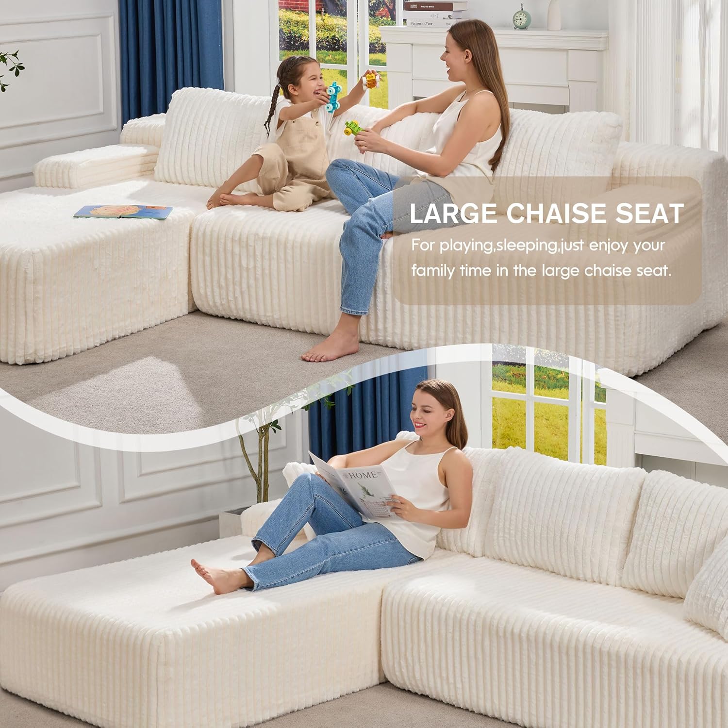 Hobestluk Modular Sectional Sofa Couches 108" L-Shape Couch 3 Seat Modular Sofa Memory Foam Sectional Couches for Living Room, Boneless Couch with Oversized Chaise (White, Left Facing)