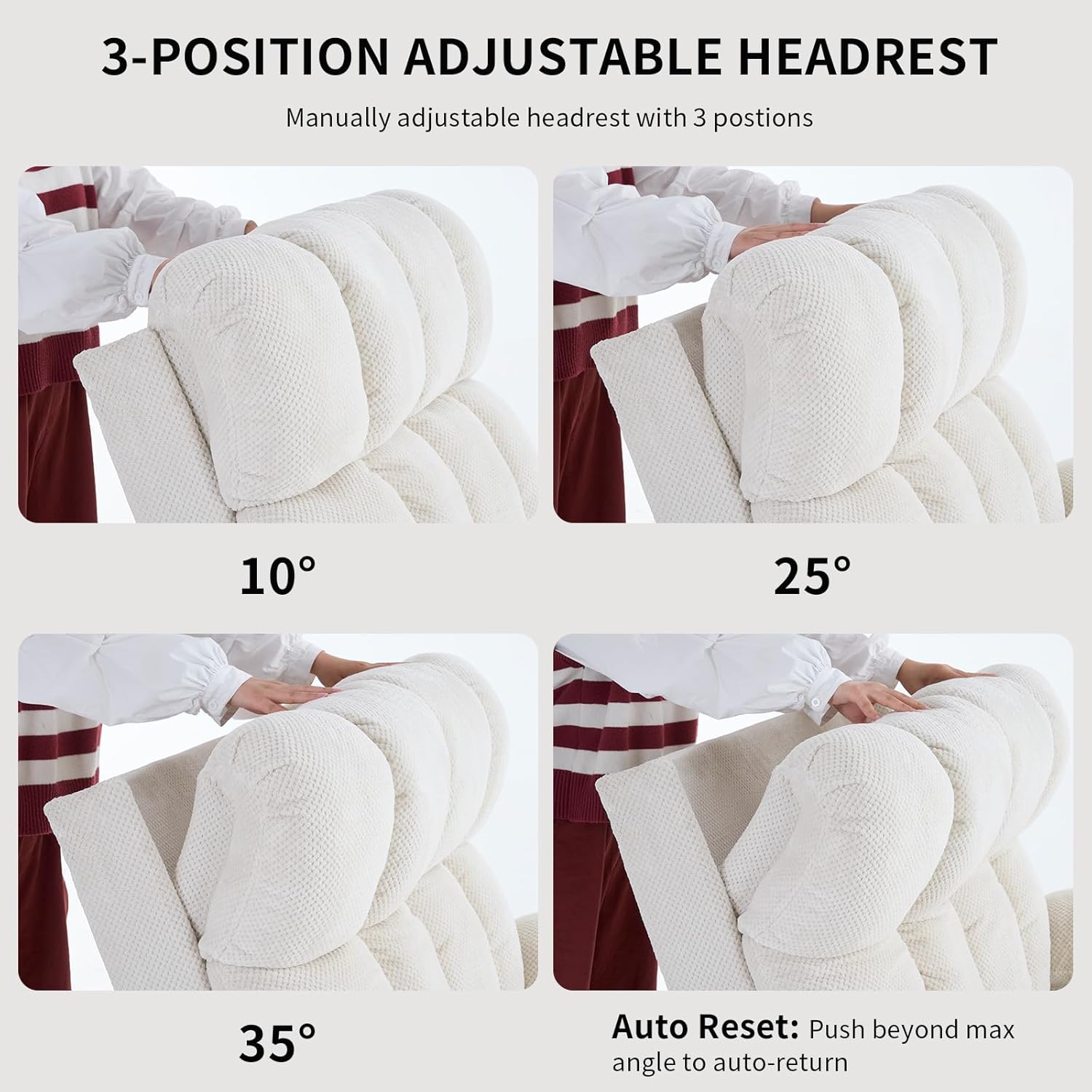 - Manual Headrest adjustment: Electric recliner chairs with adjustable headrests, There are three adjustable levels in total:10Β°,25Β°,35Β°. You can adjust different angles according to your application scenarios. allowing you to watch TV or lean back without straining your neck or head, for personalized comfort