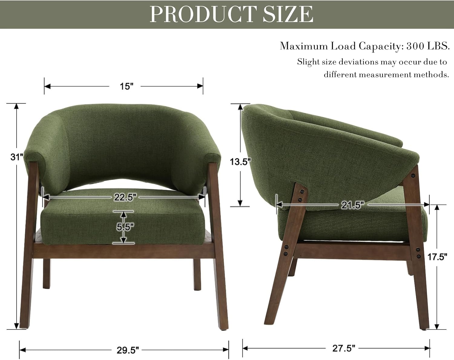 Mid-Century Modern Accent Chairs Set of 2, Comfy Barrel Armchairs with Wide Seat, Upholstered Lounge Chairs with Walnut Wood Legs for Living Room/Bedroom/Reading Corner, Linen Fabric, Deep Green