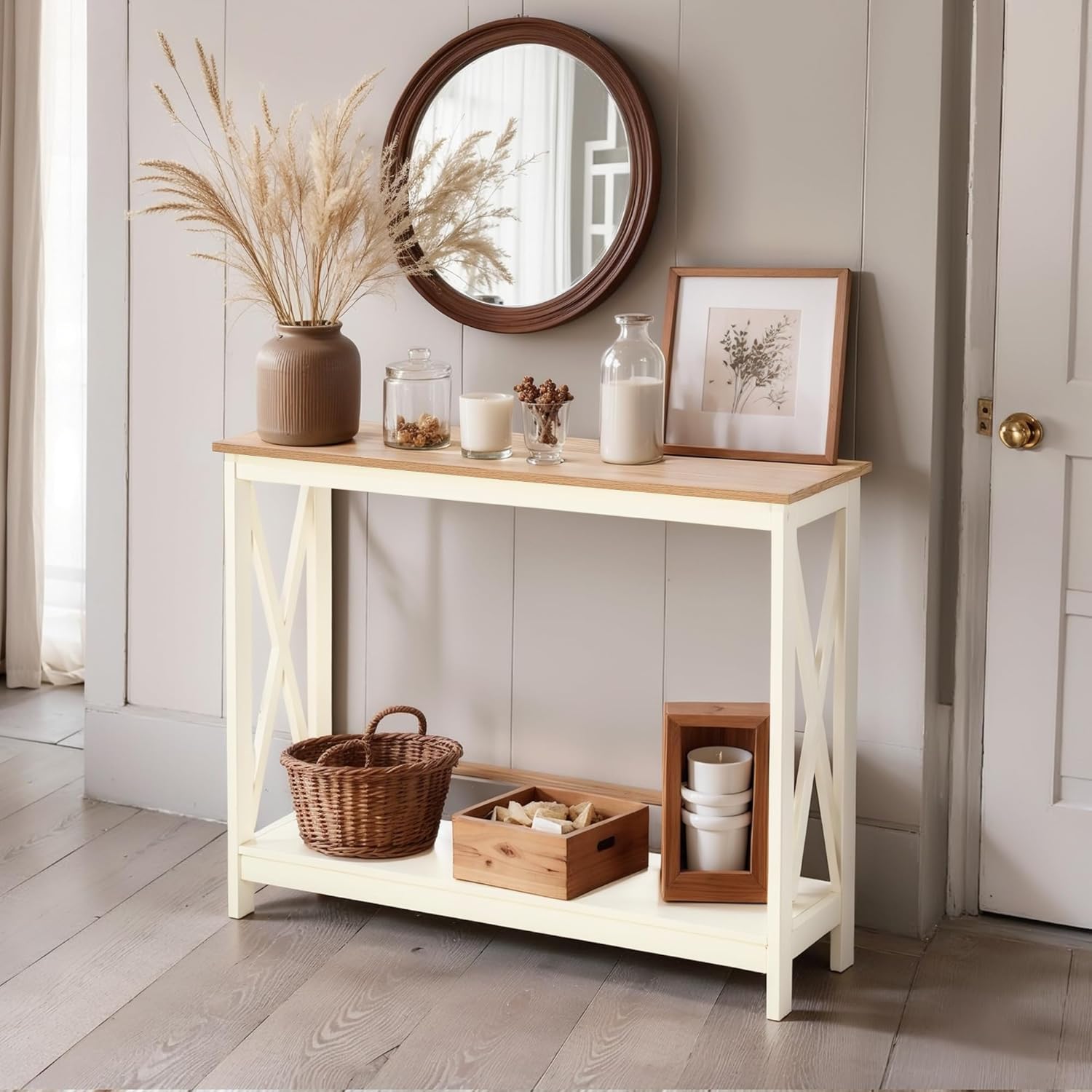 ALPHA HOME Console Table for Entryway, 2 Tier Storage Shelf Farmhouse Entryway Table, X-Shaped Design Narrow Sofa Table for Hallway, Living Room, Ivory