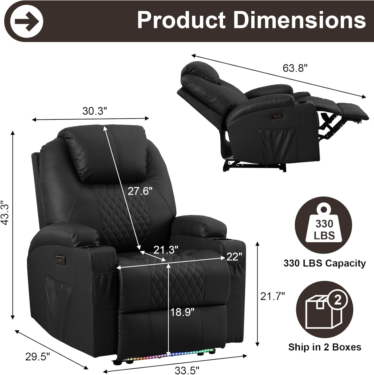 AHMED Power Recliner Chair with Vibration Massage & Heat for Adults, Faux Leather Home Theater Seating with Cup Holders/LED Lights/USB Ports/Side Pockets for Living Room, Black