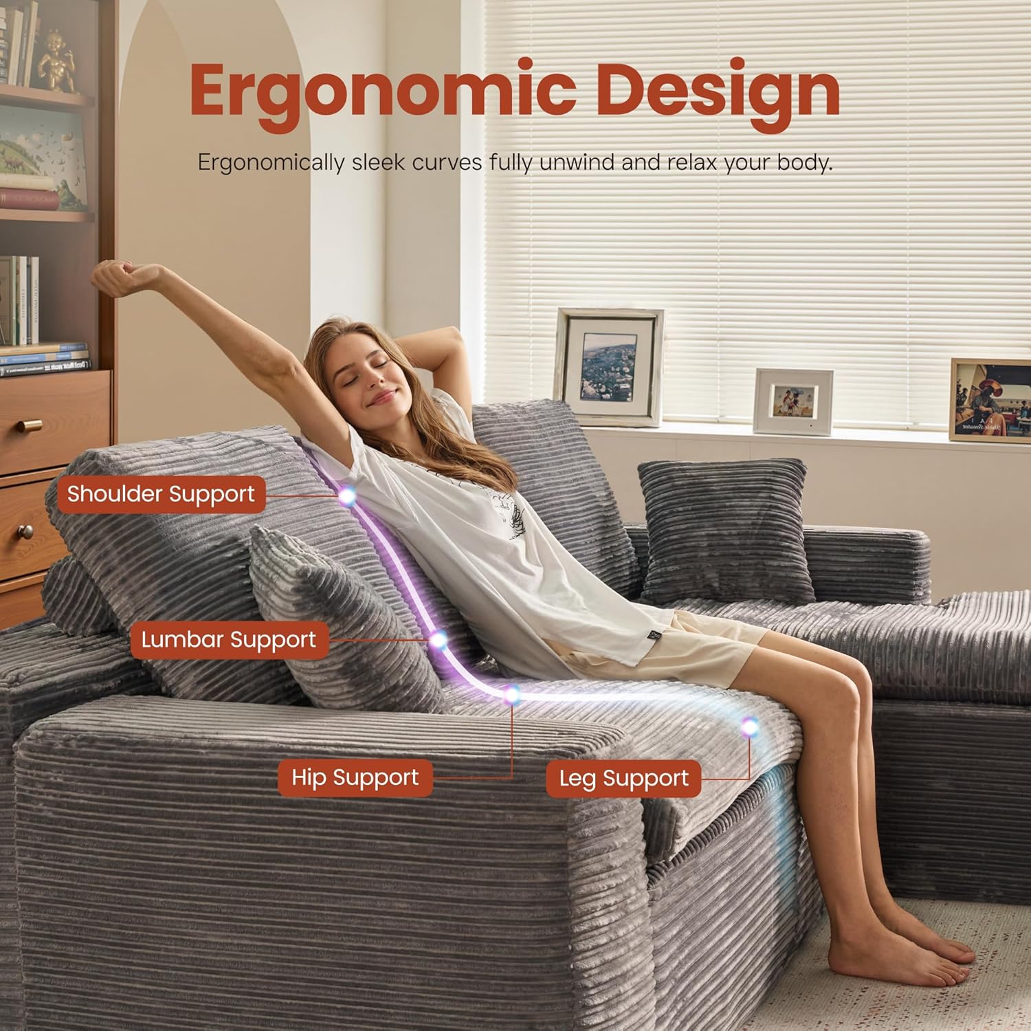 - Corduroy Fabric:Experience the lavish comfort of our enhanced corduroy fabric, offering unmatched softness and warmth. Its impressive durability and stain-fighting prowess keep your sofas looking fresh and lively. With a variety of color choices, our corduroy chaise sofa lets you showcase your unique style while adding irresistible charm to your space