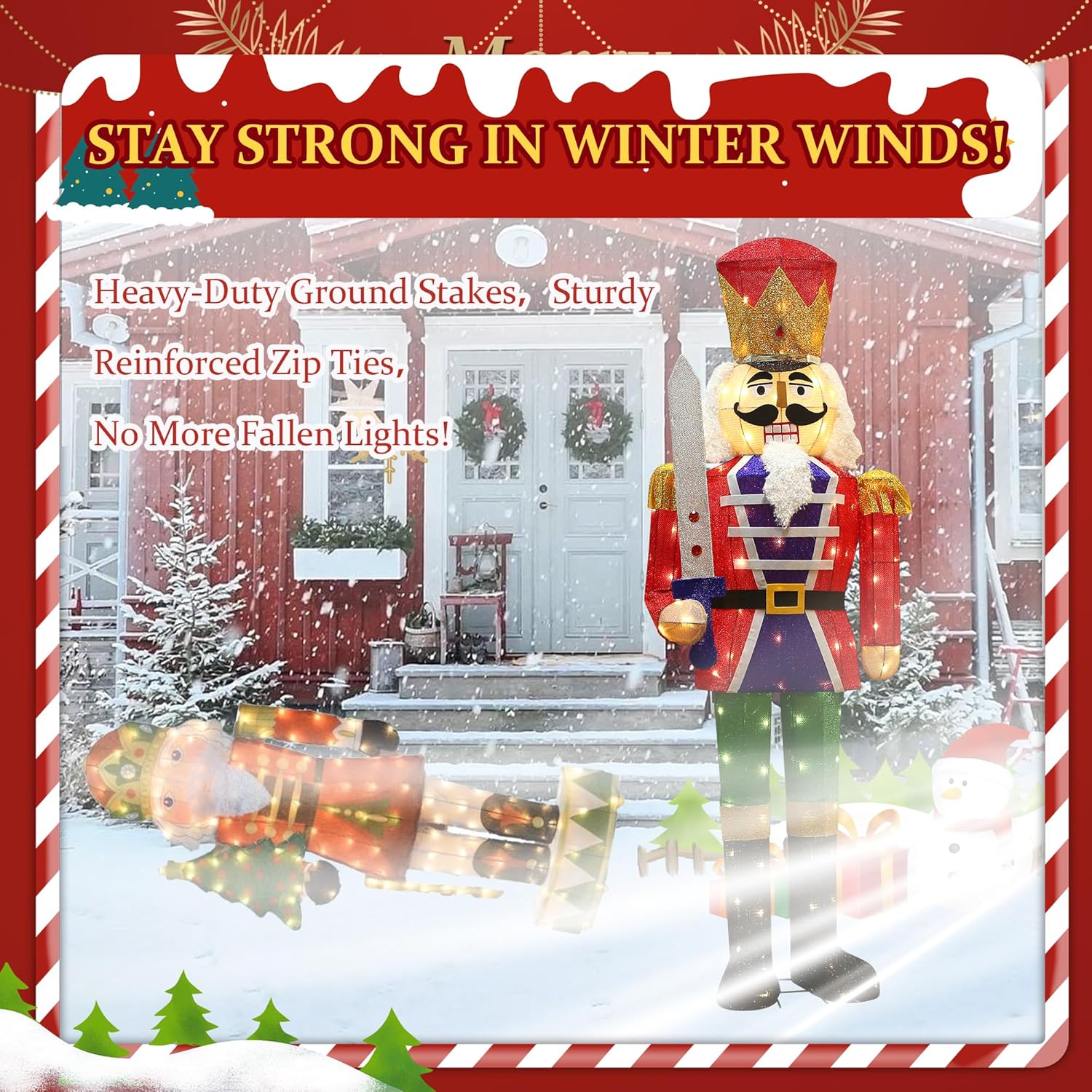 - Plug-in & Stable & Wind-Resistant--Secured with plastic ties to prevent falling apart and 4 ground stakes, perfect for outside decorations for yard and nutcracker Christmas decor. Firmly fixes the large nutcracker outdoors, resisting wind to stay upright for garden/yard decor.