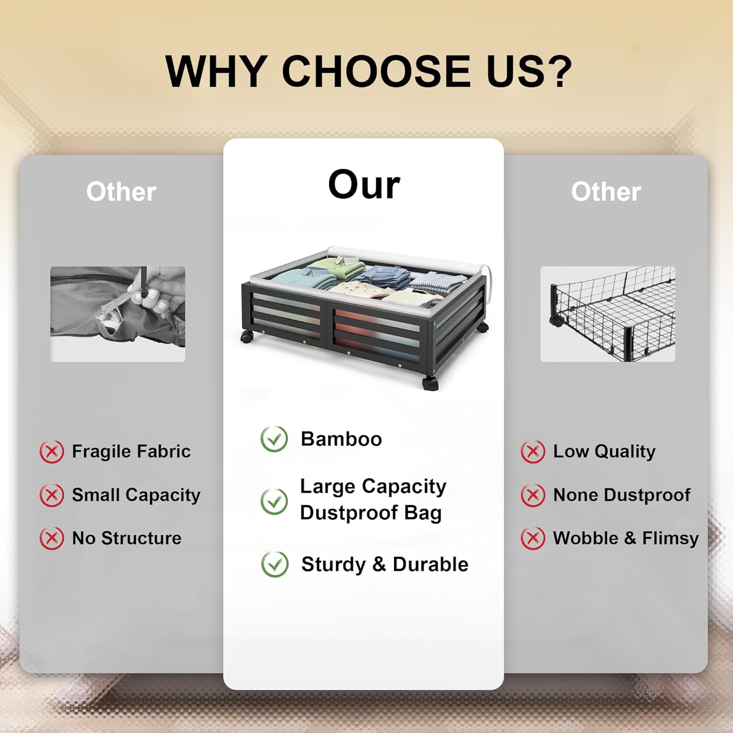 Under Bed Storage Containers With Wheels - 2 Pcs Bamboo Wood Rolling Underbed Shoe Storage Bins With Dust Bags for Clothes Blankets, Duvet Covers Snacks Toys (Black)