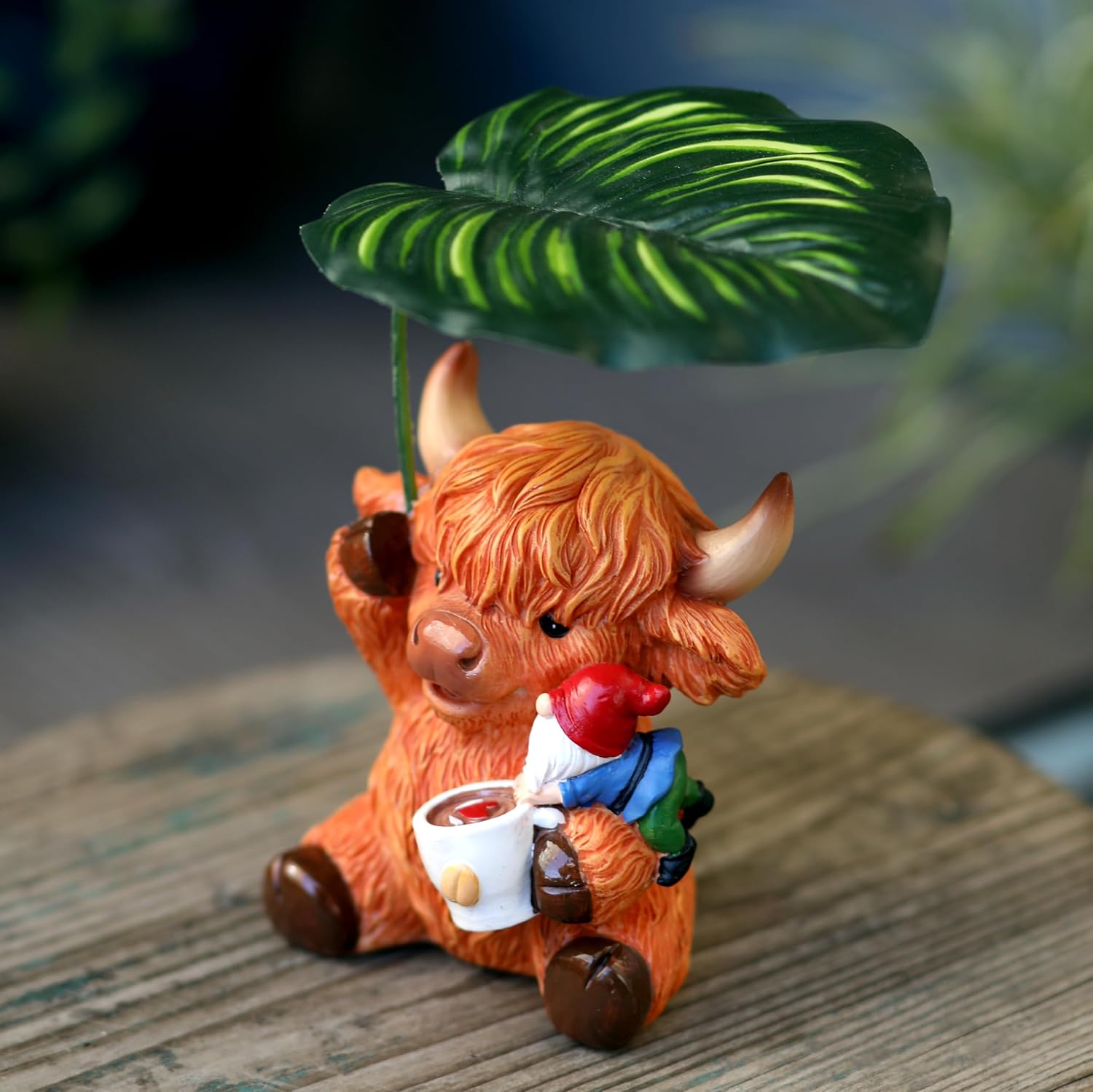- Charming design: Adorable garden highland cattle and dwarf statues, cute and fun calves and dwarfs enjoying coffee together while holding leaf umbrellas