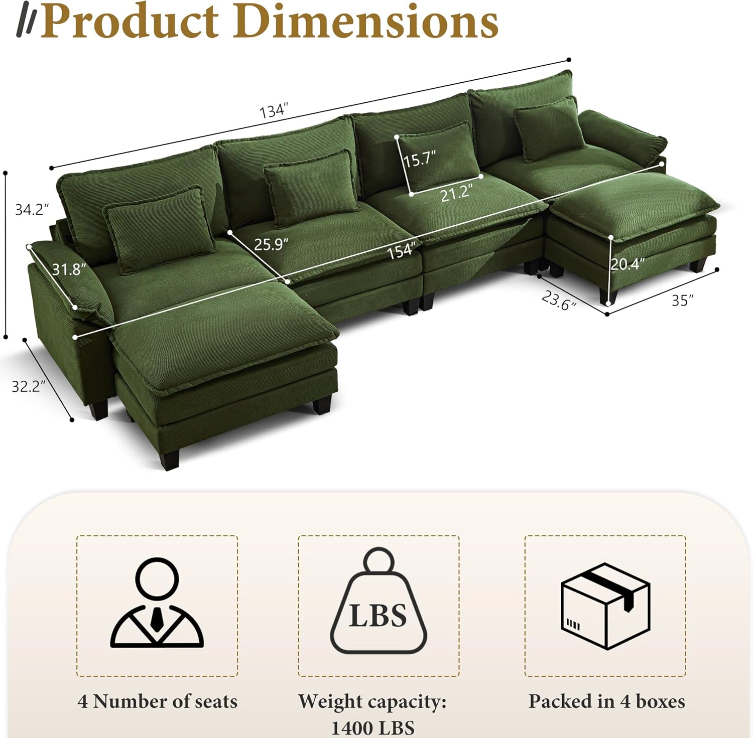 URRED Modular Sectional Sofa Comfy Cloud Couch, Modern Corduroy Sofa Sleeper Deep Seat Couches with Ottoman/Pillows for Living Room (Green, 154'' - U Shape)
