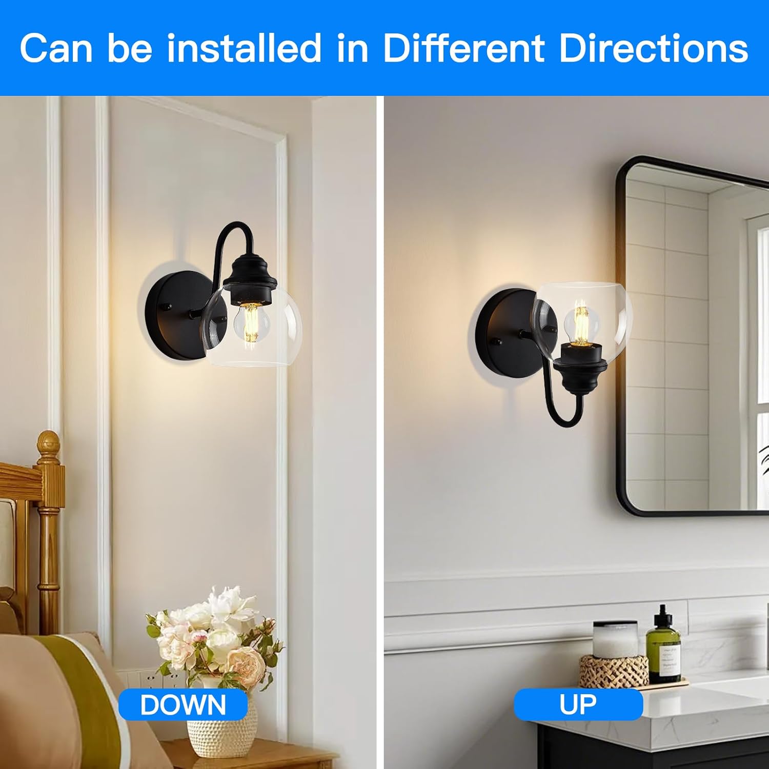 - ăLights Set Upward or Downwardă: These wall mounted light fixtures make it easy to install decorative up/down wall lights in many different areas you want, the modern wall light fixture can be installed downward as a bathroom vanity light or bedroom wall light, or installed upward as a fireplace light or dining room wall light, so this wall light can go into any style and will not look so obtrusive, instead it will add decoration to your space.