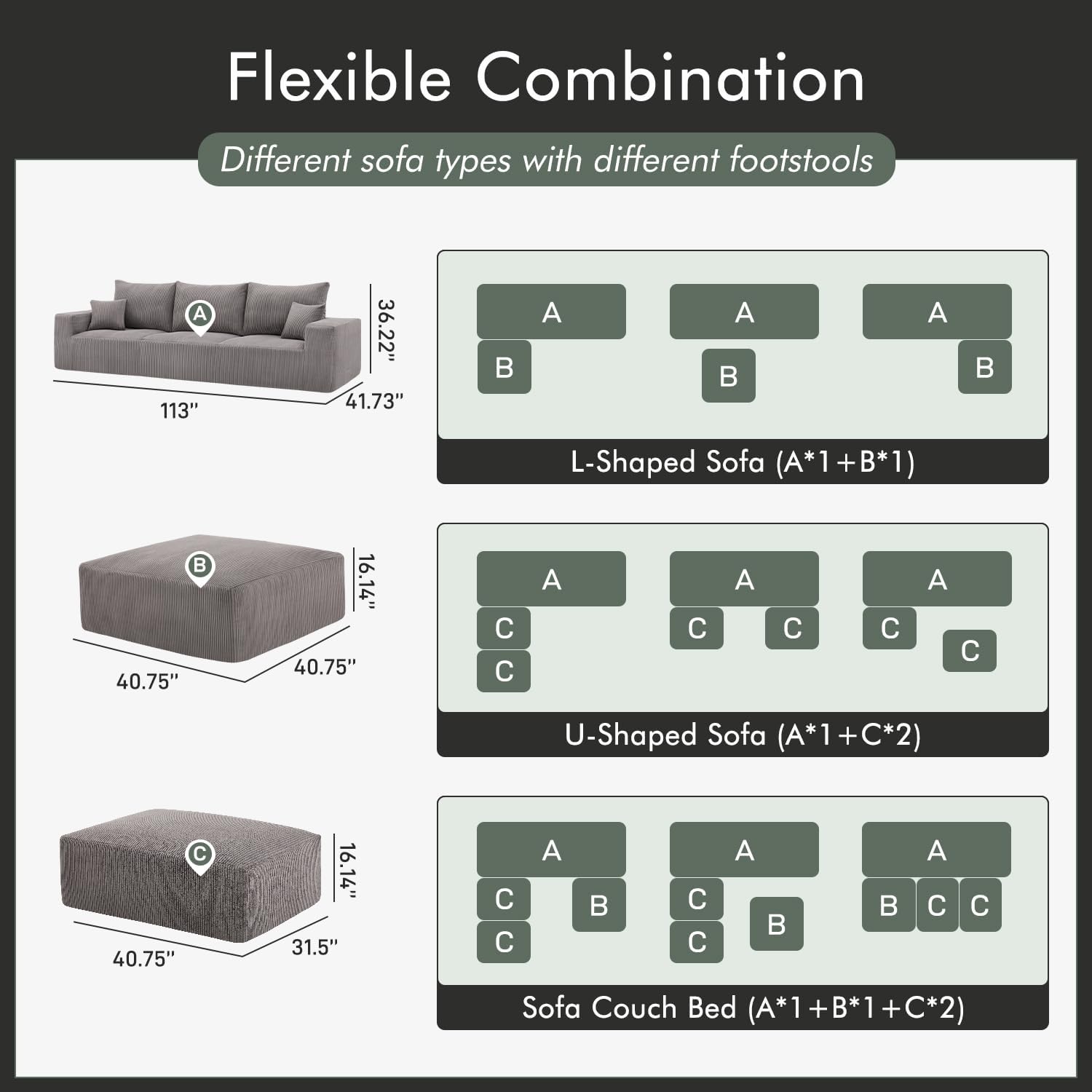Boneless Sectional Cloud Couch Sofa for Living Room, 112" L-Shaped Modular Modern Lounge Sleeper Grey Couches with Chaise, No Assemble, Cordury Compression Upholstered Sofas