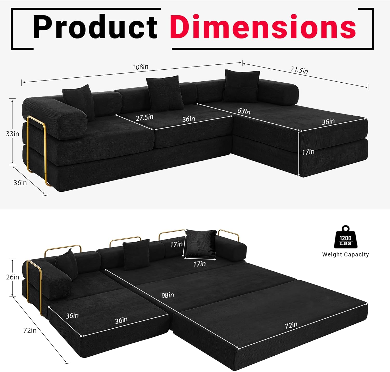 - Spacious and Cozy: Modern sofa size: 108" D x 71.5" W x 33" H.; Sleeper sofa bed size: 108"L x 98"W x26"H. Oversized L-shape design comfortably seats multiple people; perfect for families or entertaining guests.