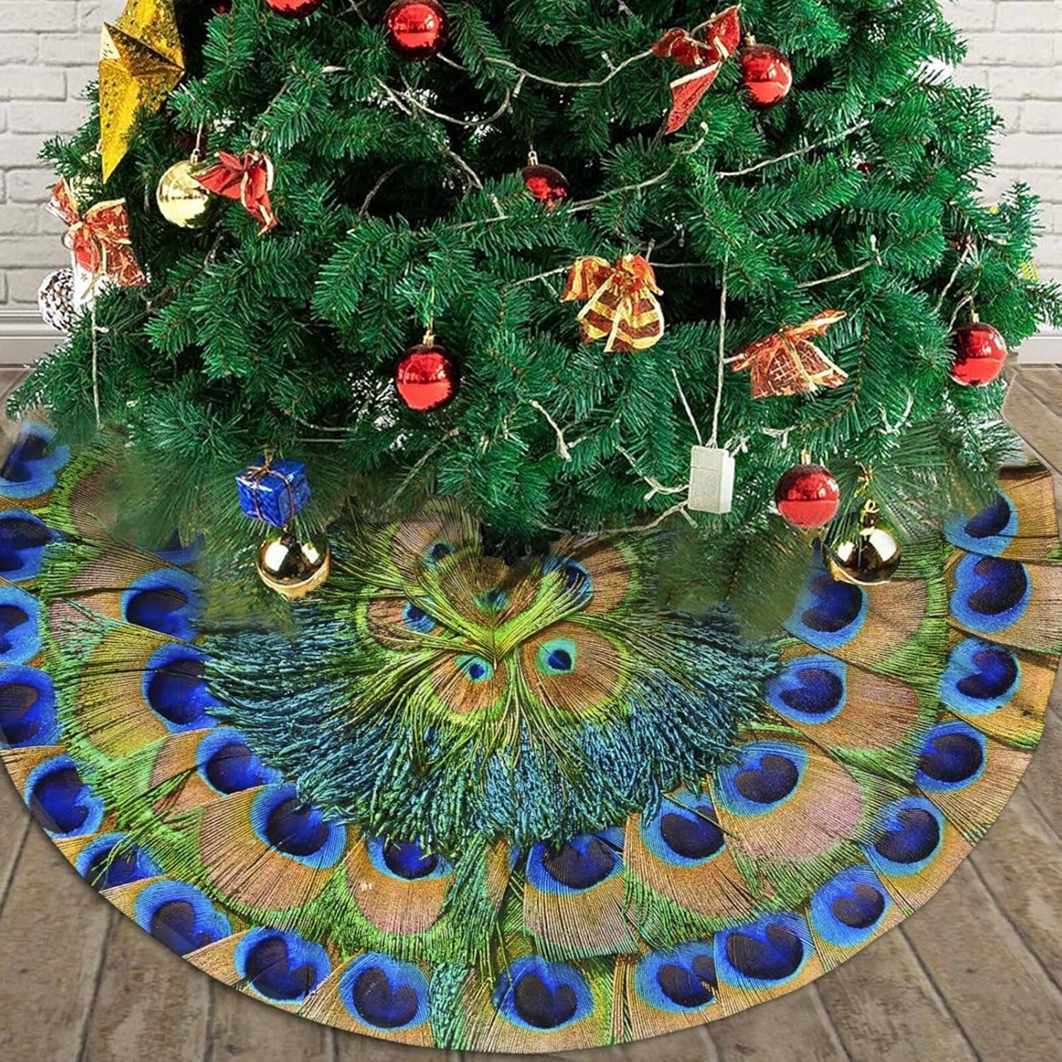 Christmas Tree Skirt,Peacock Feathers Circle Xmas Tree Skirt Rustic Farmhouse Tree Skirt for Christmas Decor Xmas Holiday Home Party Decorations36