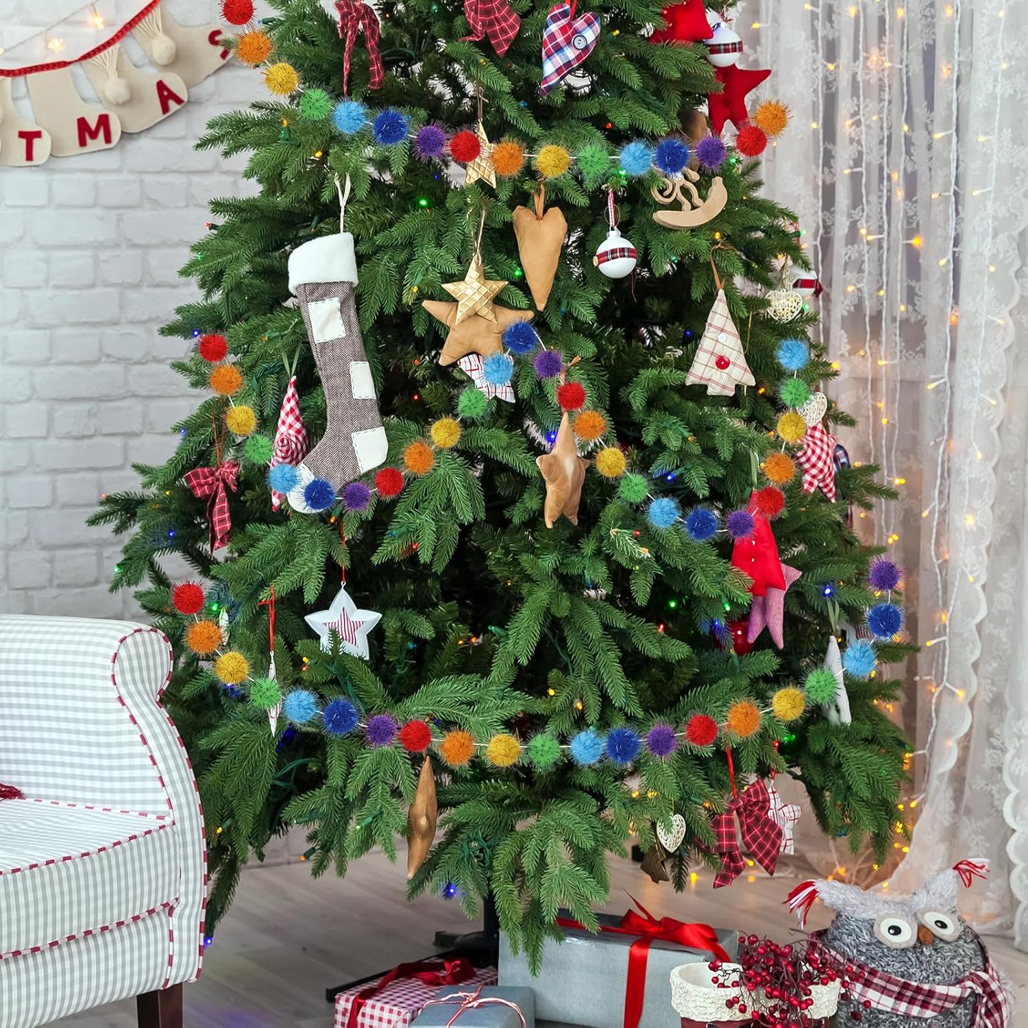 - Rainbow Glitter Pom Pom Garland Decorations, Christmas Felt Ball Garland for Mantle, Indoor Home Decor, Tree Ornaments, Kids Room and Party Hanging