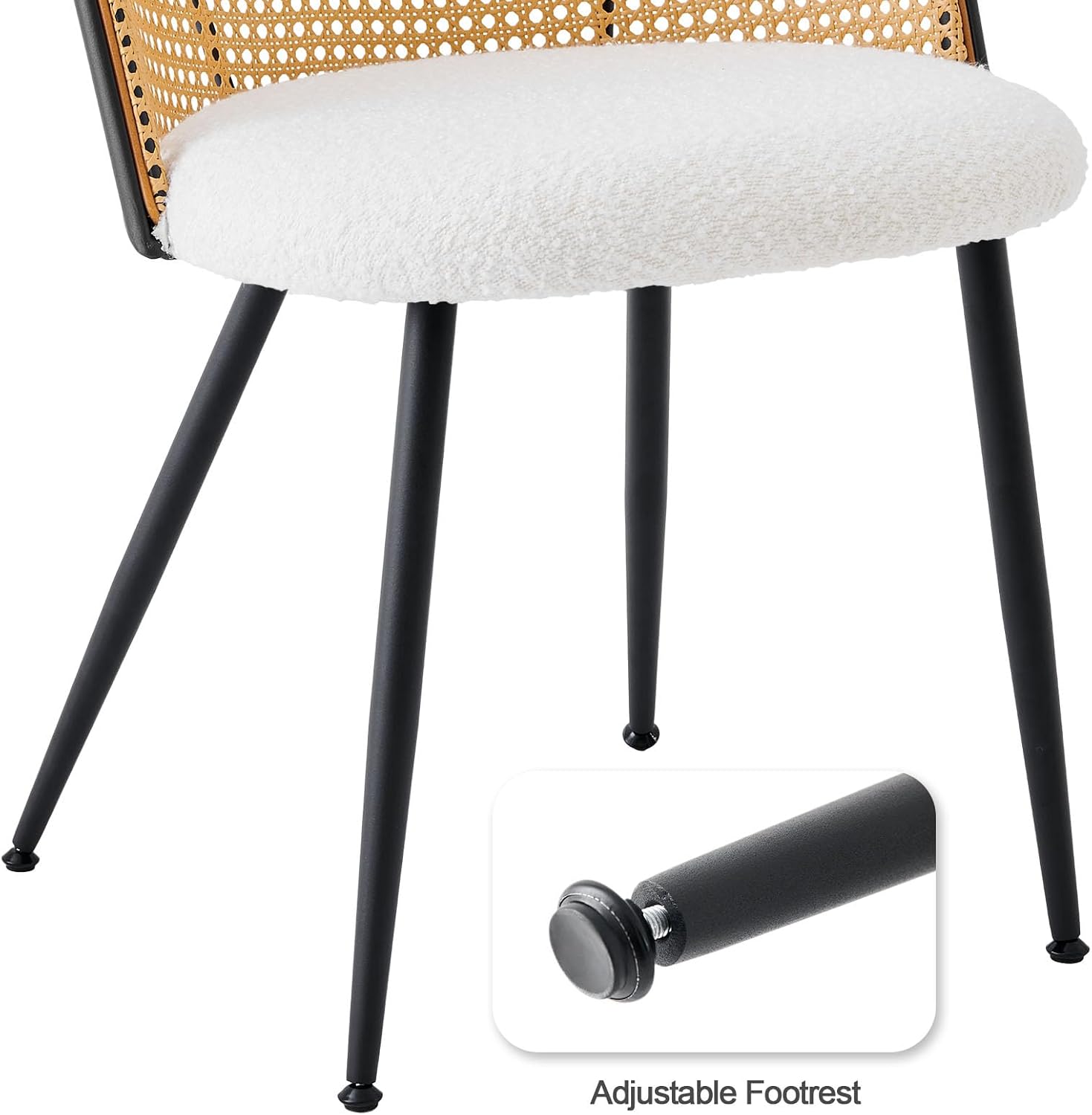 Rattan Dining Chairs Set of 6, Mid-Century Modern Kitchen Dining Room Chairs with Full Cane Backrest Armless Upholstered Farmhouse Boucle Dining Chairs with Metal Leqs for Dining Room, White