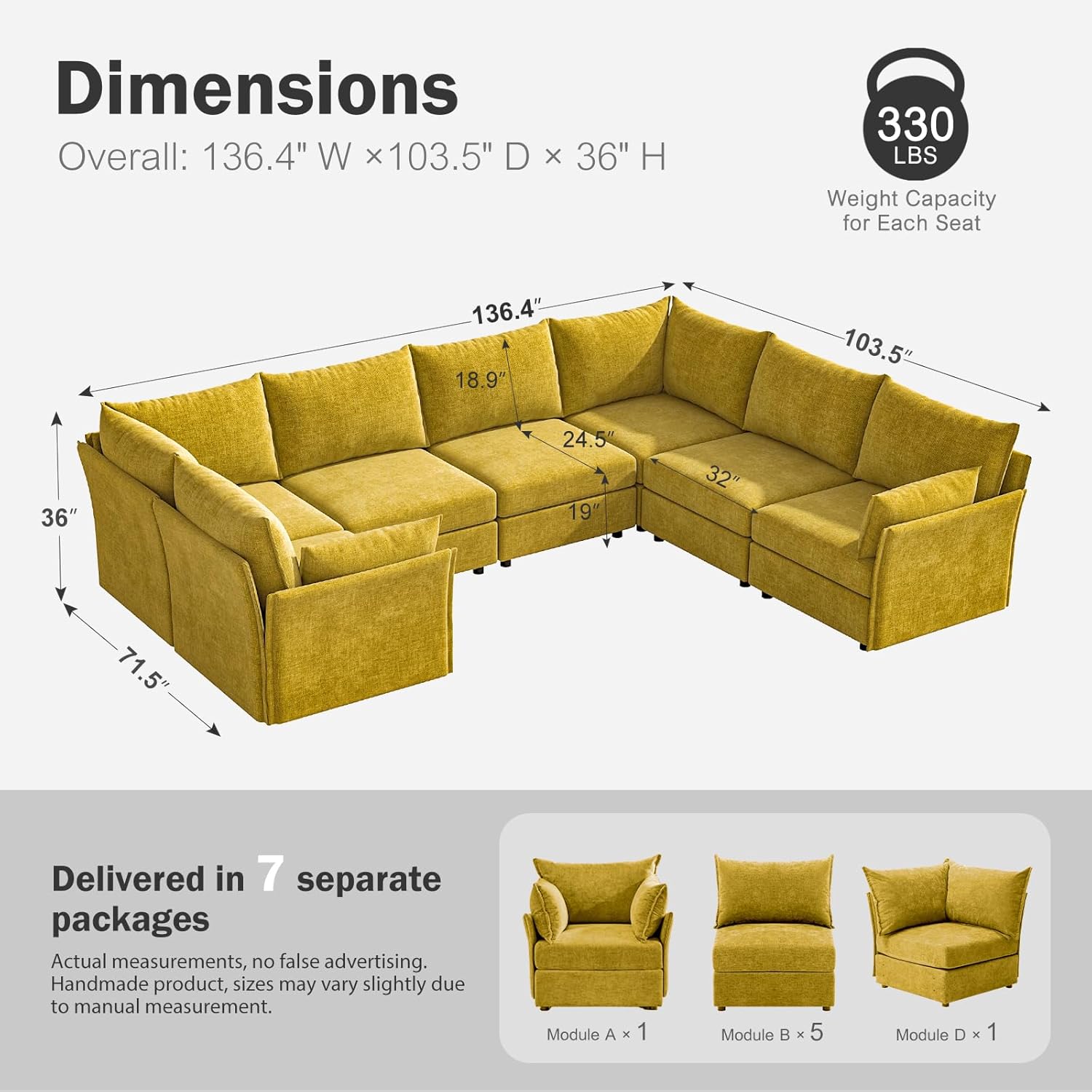 - đź’ˇ Stylish and Spacious Sectional Sofa - A blend of modern elegance and comfort, this yellow sofa is ideal for contemporary interiors. Customize seating and shape by adding or removing modules to fit your needs. It's perfect for your living room, family room, bedroom, or office. Overall size: 136.4" W Ă— 103.5" D Ă— 36" H, seat width: 32", seat depth: 24.5".
