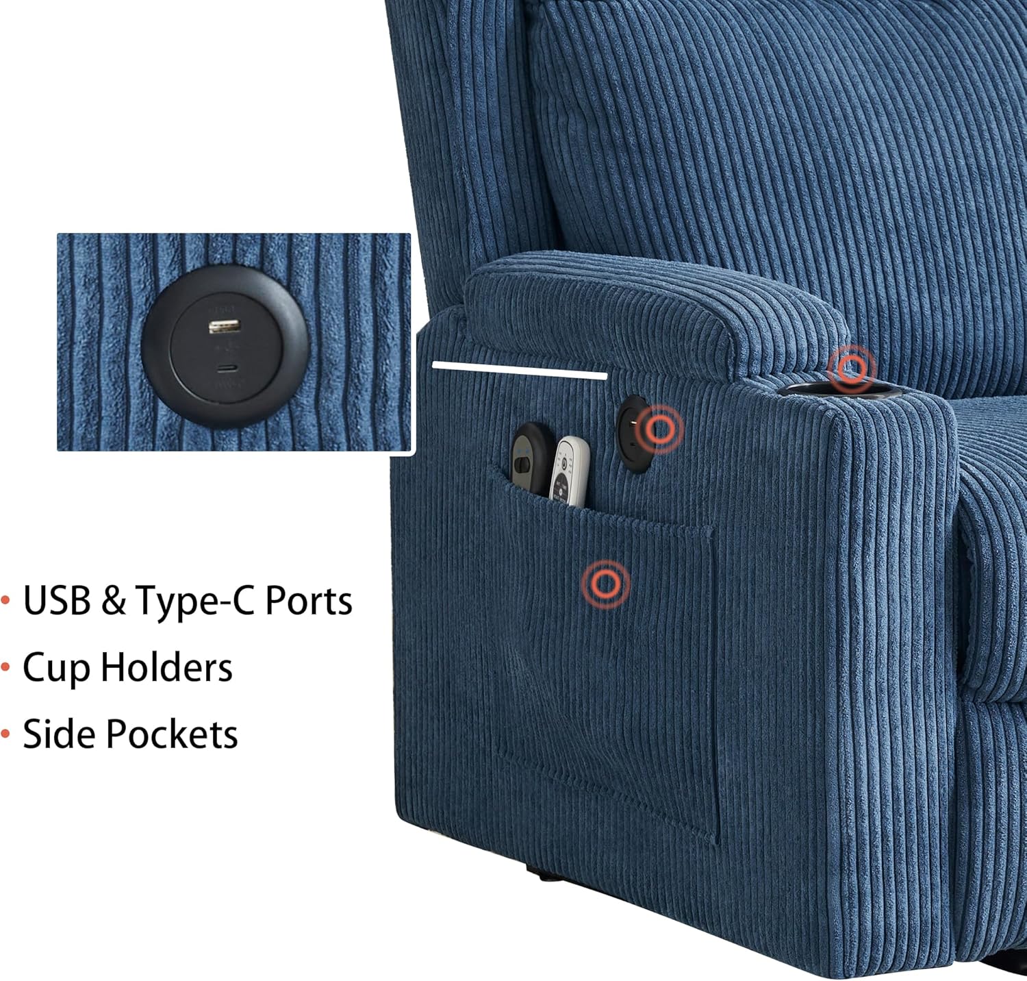 Lift Recliner Chair for Adults with Massage and Heating, Power Lift Recliner Chairs for Elderly, Corduroy Fabric Reclining Chair with USB &Type-C Port, Cup Holders, L6111 (Blue)