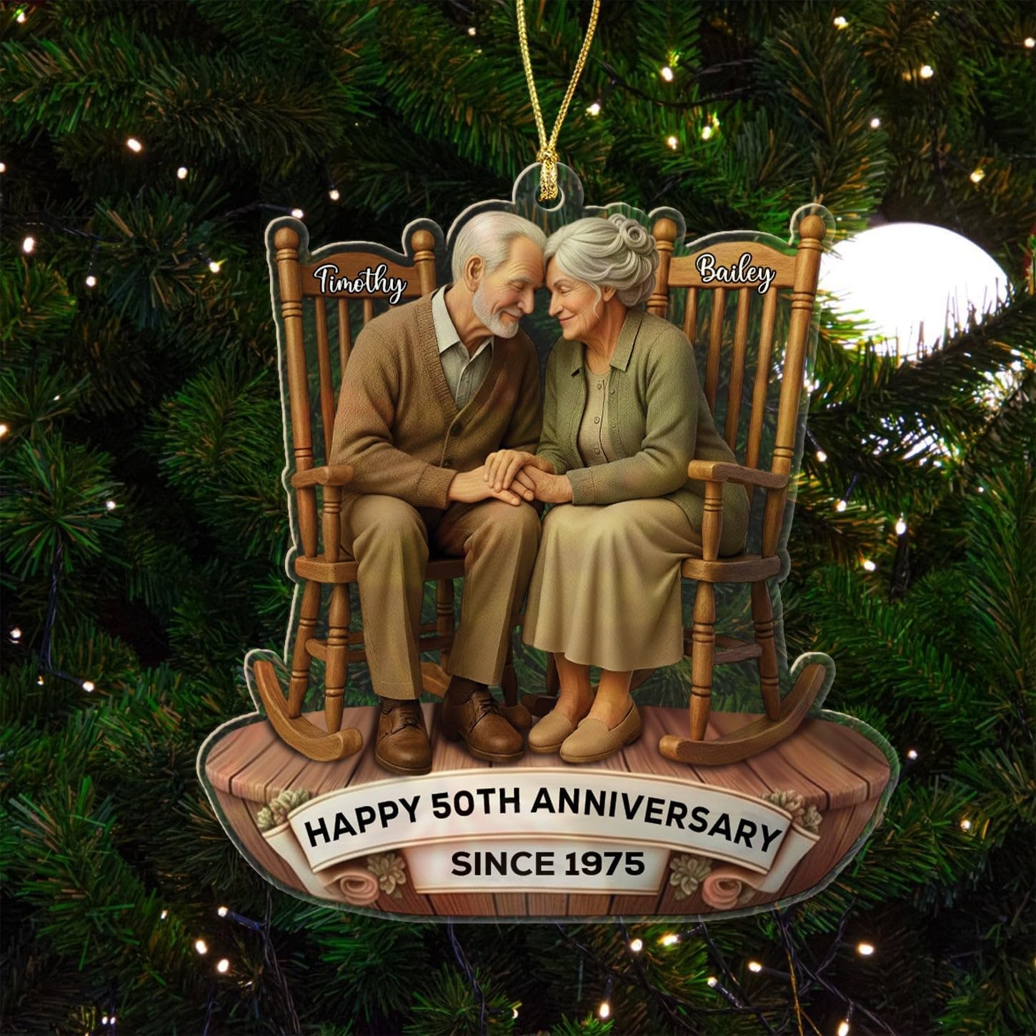 Personalized 50th Anniversary Shaped Christmas Ornament 2025, Old Couple Sitting On Rocking Chairs Together Ornaments Gift for Wedding Anniversary, Custom Text Name Ornament for Parents Grandparents