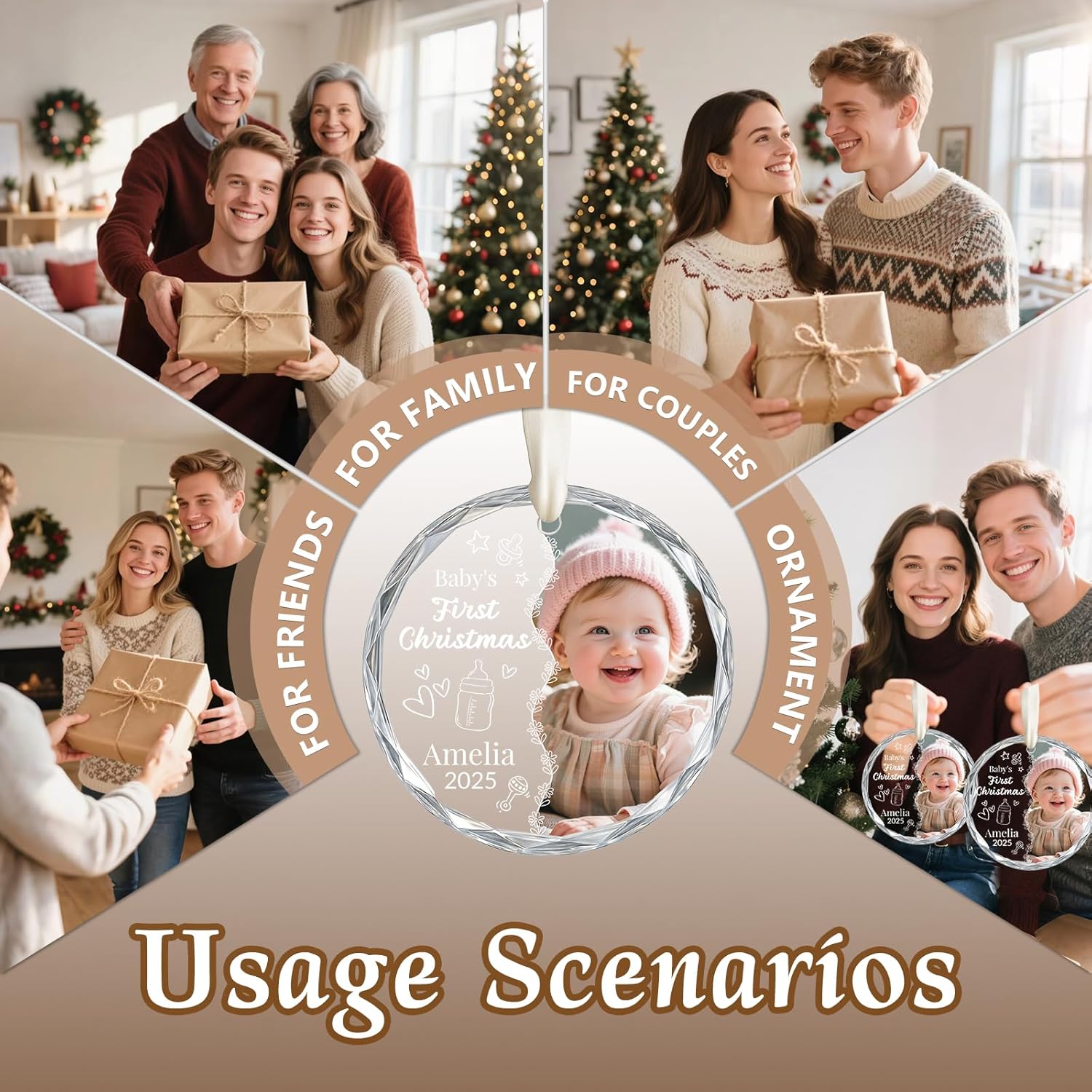 Personalized Baby's First Christmas Ornament 2025, Custom Christmas Photo Crystal Glass Ornaments with Name or Date, Personalized Christmas Tree Decor Gifts for Family, Friends,Pet or Baby